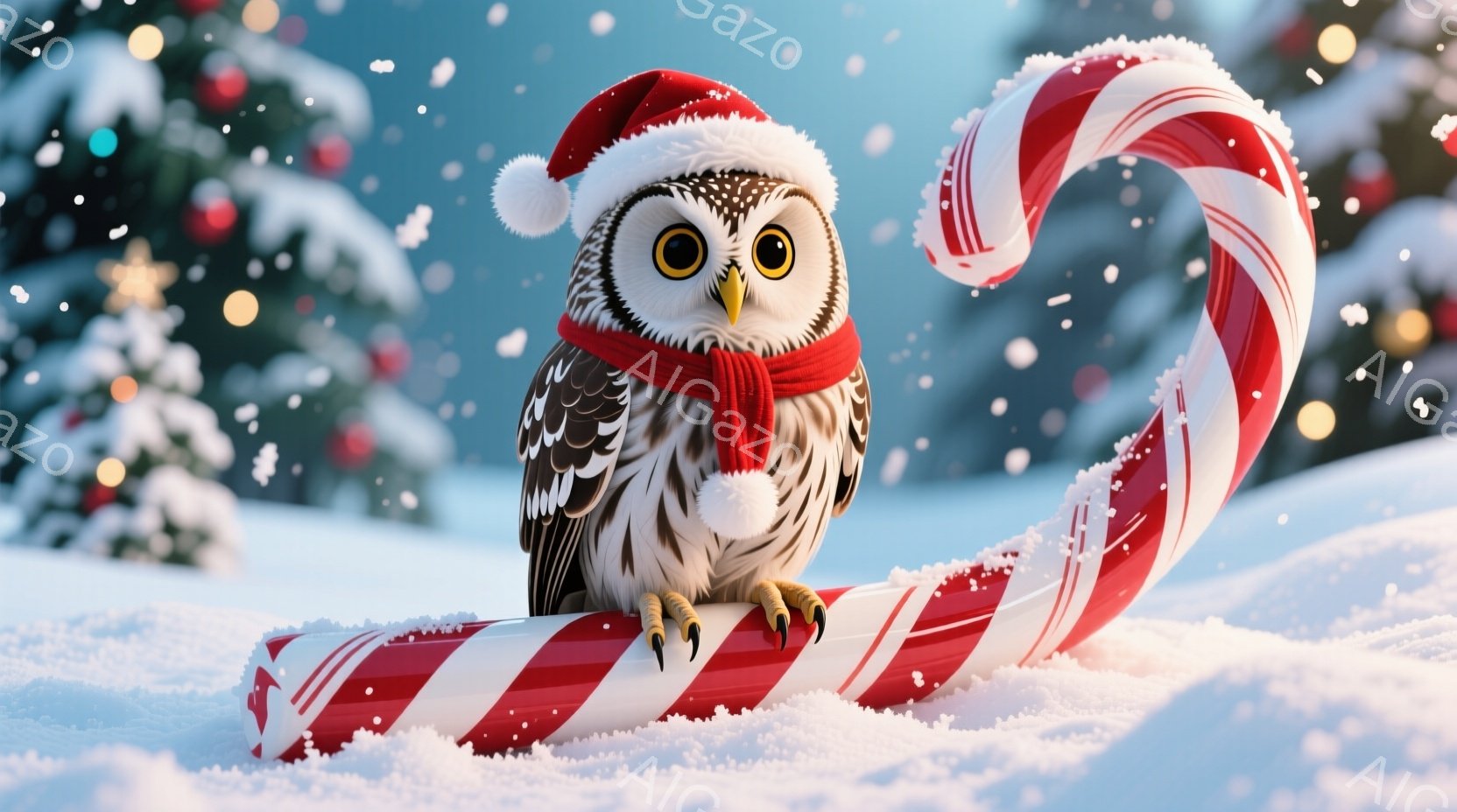 雪景色の中に、赤と白のキャンディケーンの上に止まったフクロウがいます。フクロウは鋭い目つきで正面を見つめ、その羽毛は茶色と白の美しい模様で覆われています。背景には、雪に覆われた木々がぼんやりと見え、全体的に冬の暖かく幻想的な雰囲気が漂っています。
