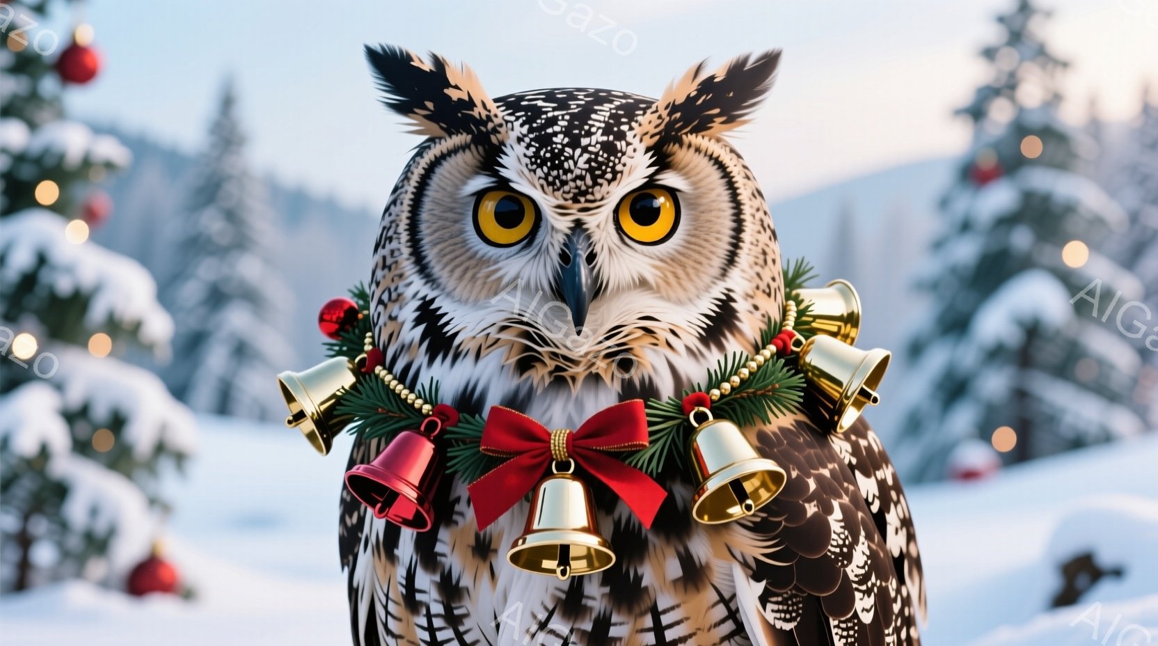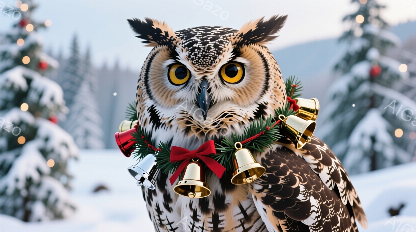 巨大なフクロウが雪景色の中で正面を向いており、首には赤いリボンと金色の鐘が飾られたクリスマス風の首飾りをつけている。その鋭い目は金色に輝き、茶色と白の複雑な羽毛は鮮明に捉えられている。背景には雪に覆われた木々がぼんやりと見え、冬の静寂と温かい祝祭の雰囲気を醸し出している。