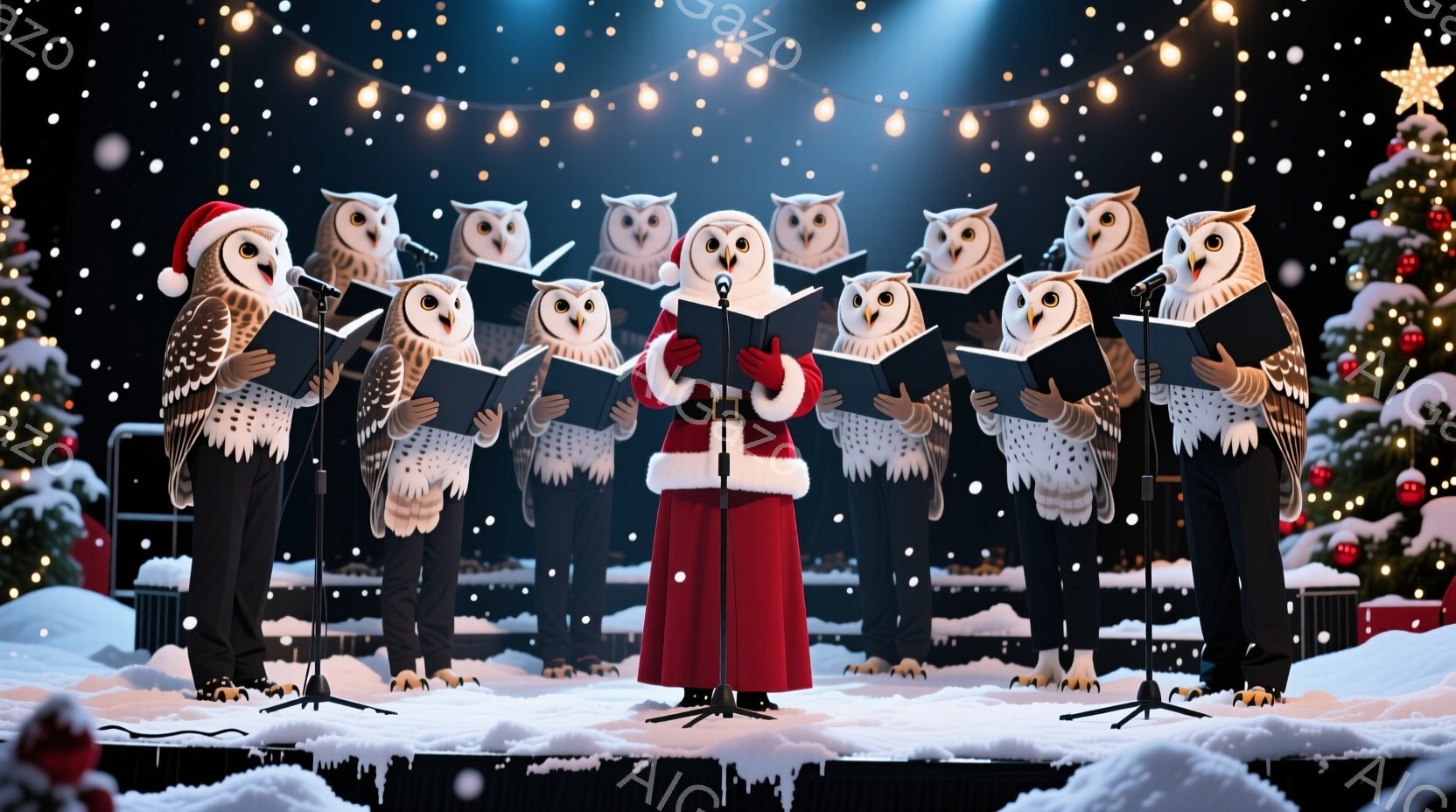 この無料AI生成画像「一本の街灯の装飾に、大きなフクロウが止まっています。フクロウは鋭い眼差しで正面を見つめ、茶色と白の美しい模様が特徴的です。背景には淡い空が広がり、赤や緑のオーナメントで飾られた街灯と、鮮やかな赤いリボンがクリスマスらしい雰囲気を醸し出しています。」は、2025年10月25日に作成されました。 サイズは 1664×928px の高解像度で、商用利用も可能なフリー素材として提供しています。