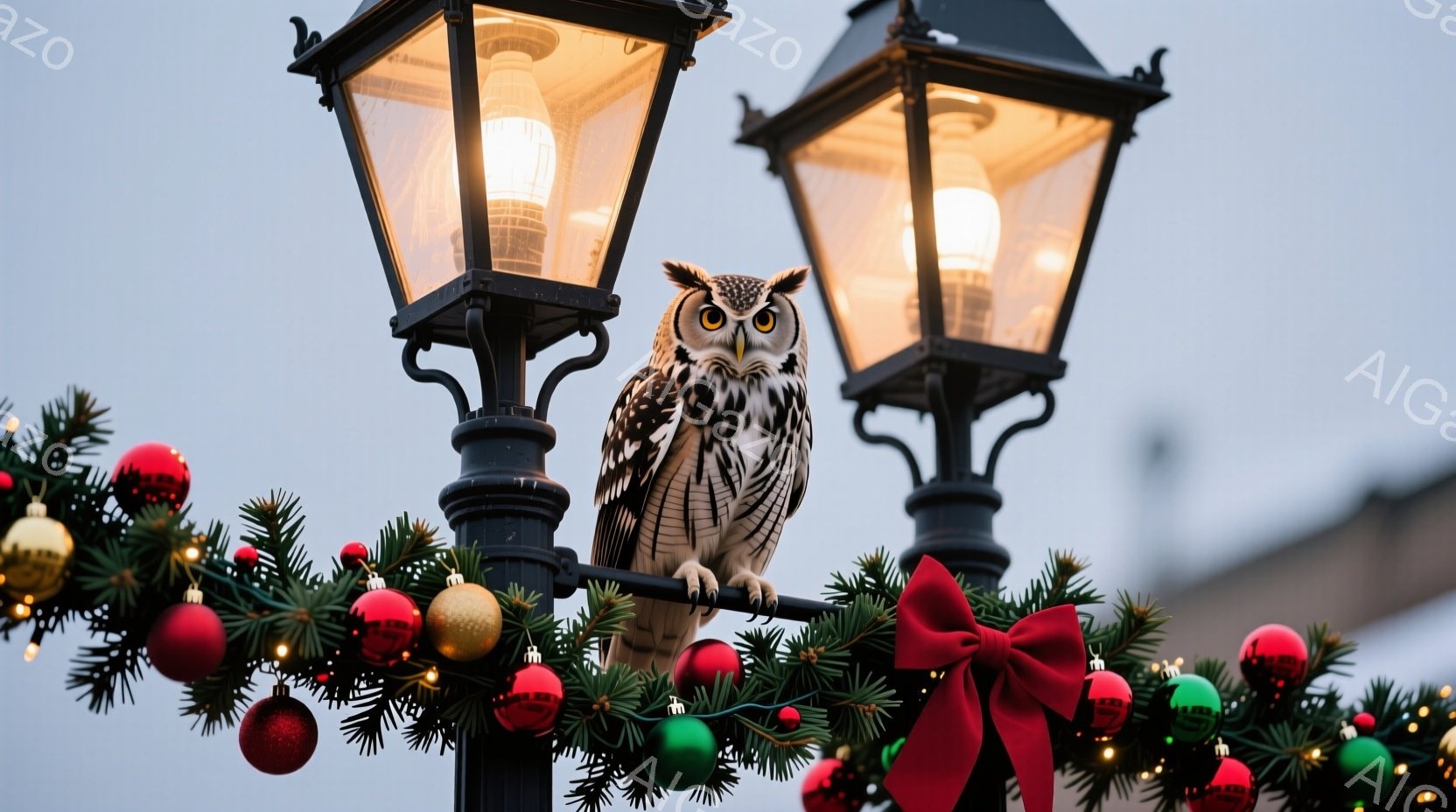 街灯の上に、大きなフクロウがとまっており、その周りにはクリスマスデコレーションが飾られています。フクロウは鋭い眼差しで正面を見つめ、静かに周囲を観察しているようです。背景は明るい空で、クリスマスの飾り付けが冬の風景に華やかさを添えています。