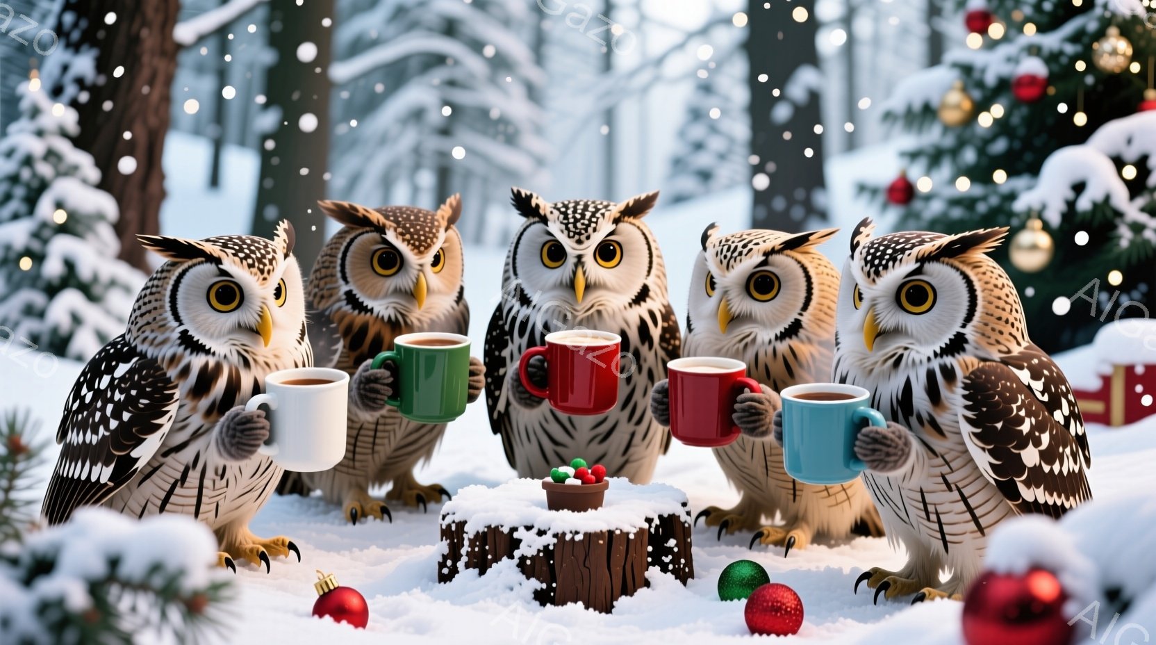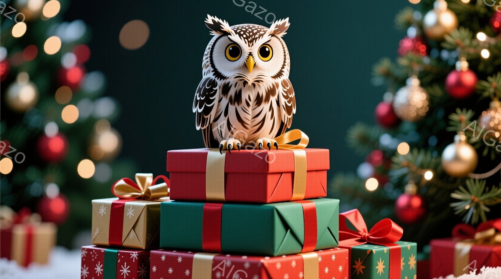 深緑の背景に、積み重ねられたプレゼントボックスの上にフクロウが止まっています。フクロウは茶色と白の羽毛を持ち、鋭い目つきで正面を見つめており、クリスマスツリーがぼやけて背景にあります。全体的に、クリスマスやホリデーシーズンを祝う暖かくお祝いの雰囲気です。