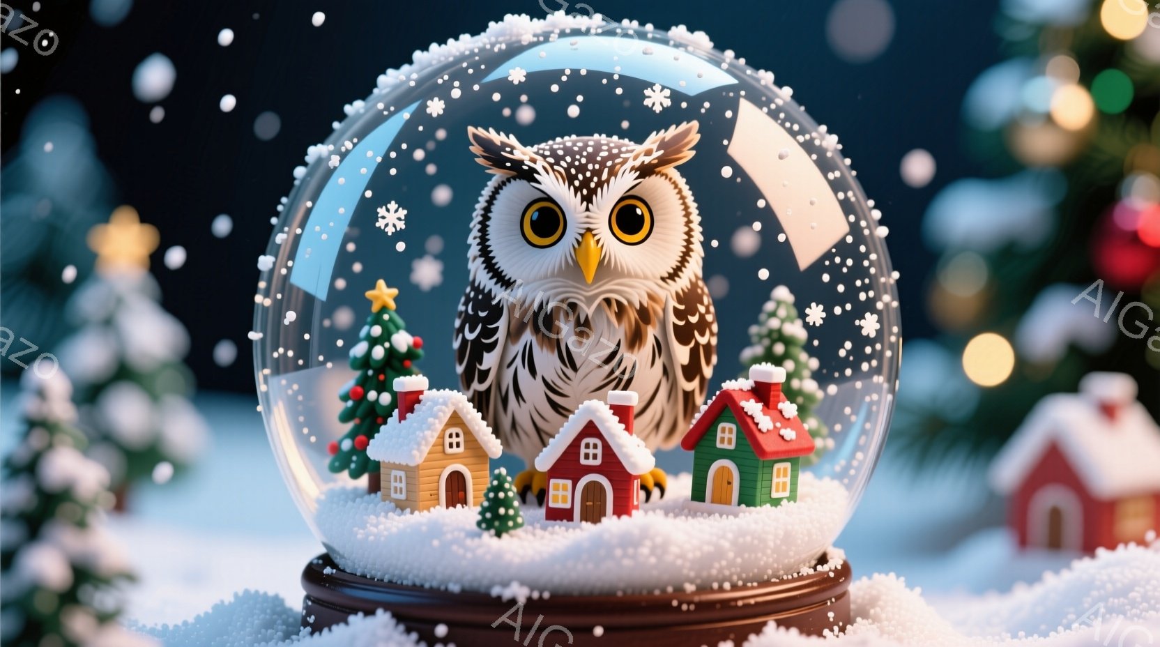 雪が舞うクリスマスの背景に、ガラス製のスノーグローブが置かれています。グローブの中には、可愛らしいフクロウが座り、その足元には小さな家々とクリスマスツリーが配置されています。全体的に暖かく、幻想的な雰囲気で、冬の季節の喜びを表しています。