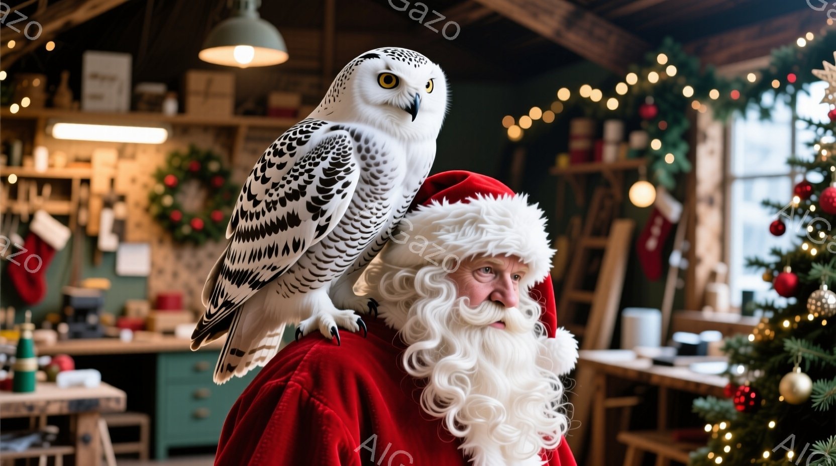 深い青色の夜空を背景に、翼を広げたフクロウが力強く飛翔している様子が描かれています。クリスマスツリーが雪景色の中に点在し、きらめく光と花火が夜空を彩り、幻想的な雰囲気を醸し出しています。全体的に、冬の夜の暖かく、お祝い的なムードが感じられます。