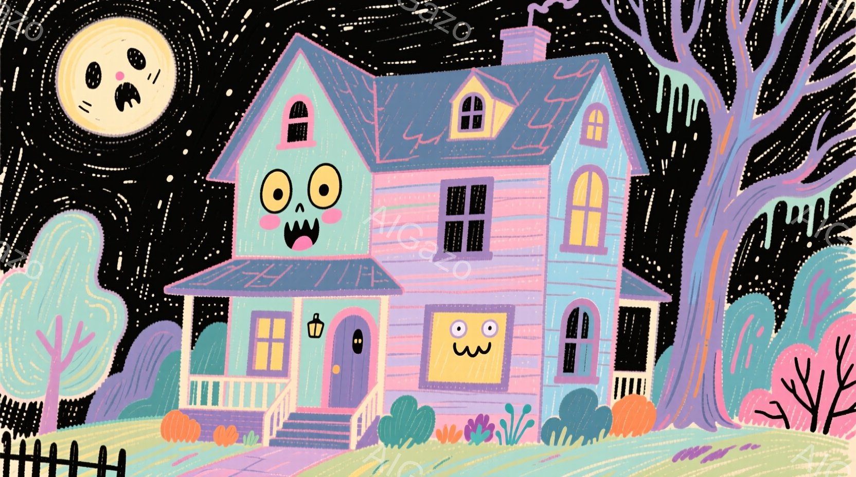 趣のある二階建ての家が、満月を背景に描かれています。家はパステルカラーで描かれ、窓や玄関には愛らしい表情が施されています。背景にはシルエット状の木々やフェンスがあり、幻想的で少し不気味な雰囲気を醸し出しています。