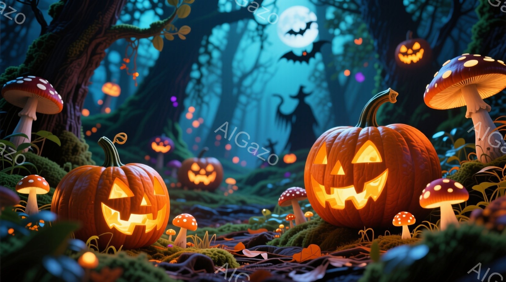 暗い森の中で、さまざまな大きさのたくさんのジャック・オー・ランタンが光り輝いている。鮮やかなオレンジ色のカボチャは不気味な笑顔を浮かべ、地面には色とりどりのキノコや落ち葉が散らばっている。背景にはシルエット状の木々と飛ぶコウモリが描かれ、ハロウィーンの神秘的で不気味な雰囲気を醸し出している。