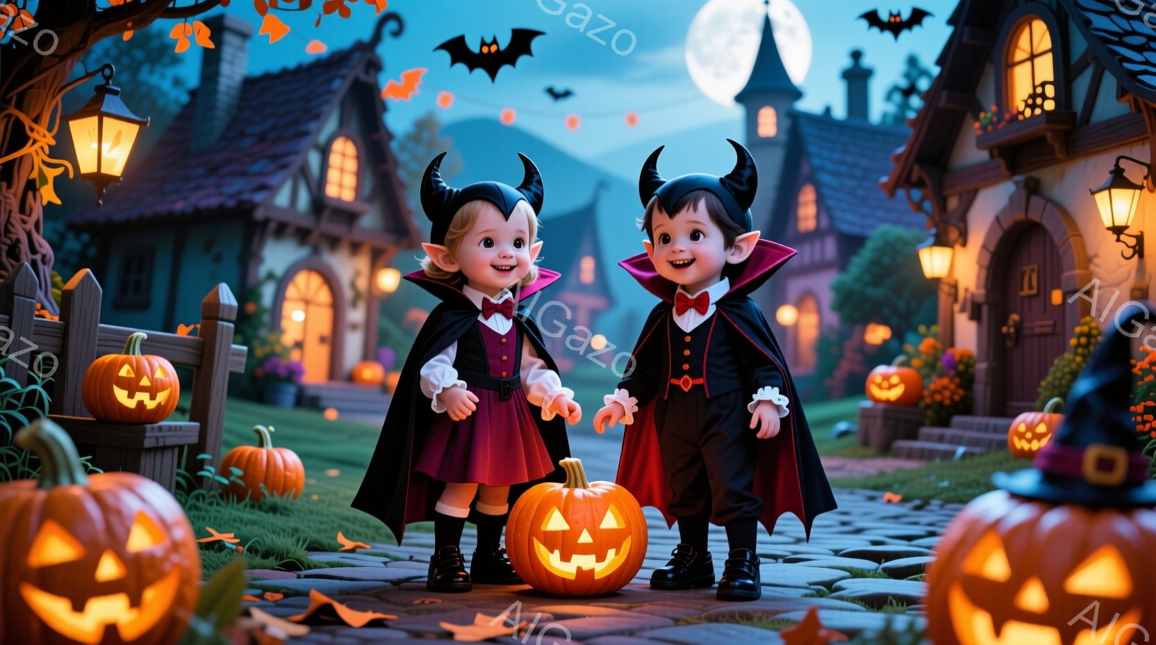 ハロウィーンの衣装を着た2人の幼い子供たちが、明るく照らされたカボチャを抱えて並んでいます。女の子はそれぞれ、魔女帽とヴァンパイアの角をつけ、赤いドレスに黒いマントを羽織っています。背景には、ライトアップされた窓を持つおとぎ話のような家々、満月、夜空を飛ぶコウモリが描かれ、ハロウィーンの楽しい雰囲気が漂っています。