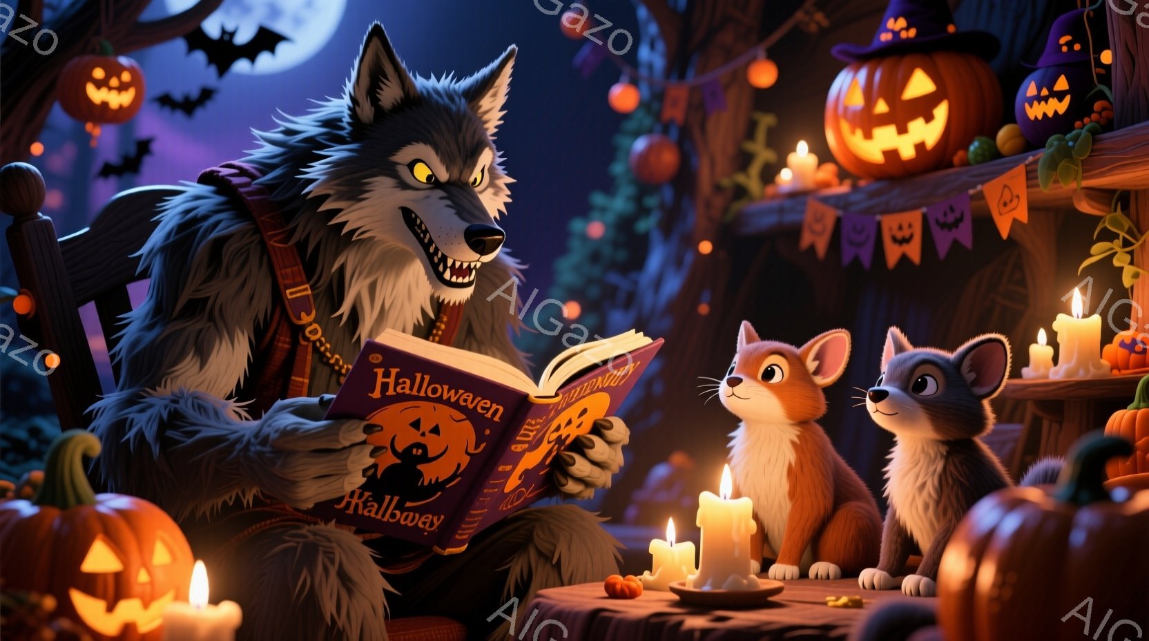 暖炉のある薄暗い部屋で、ローブを着た人物が大きなハロウィンの本を読み聞かせている。周りには、本に夢中になっている小さな動物たちが集まり、燃えるキャンドルと彫刻されたカボチャが部屋を照らしている。全体的に、ハロウィーンの夜の温かく幻想的な雰囲気が漂っている。