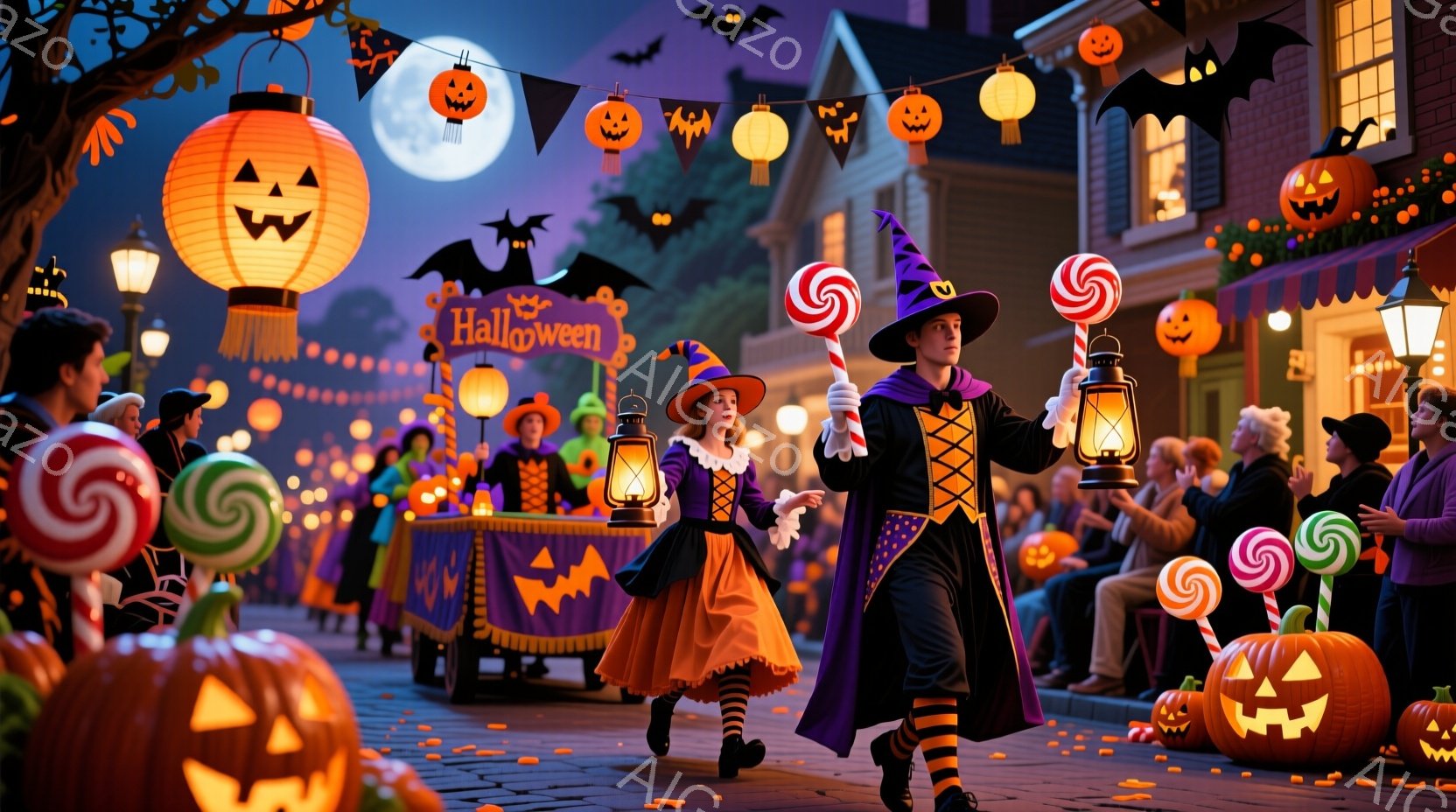 ハロウィーンの夜、子どもたちがランタンを持って歩いている様子が描かれています。先頭の女の子は黒い魔女の衣装にオレンジ色の髪、そして楽しそうな表情で歩いています。背景には、かぼちゃのランタンやキャンディーが散りばめられ、建物や木々がシルエットとなって現れ、お祭り気分を盛り上げています。