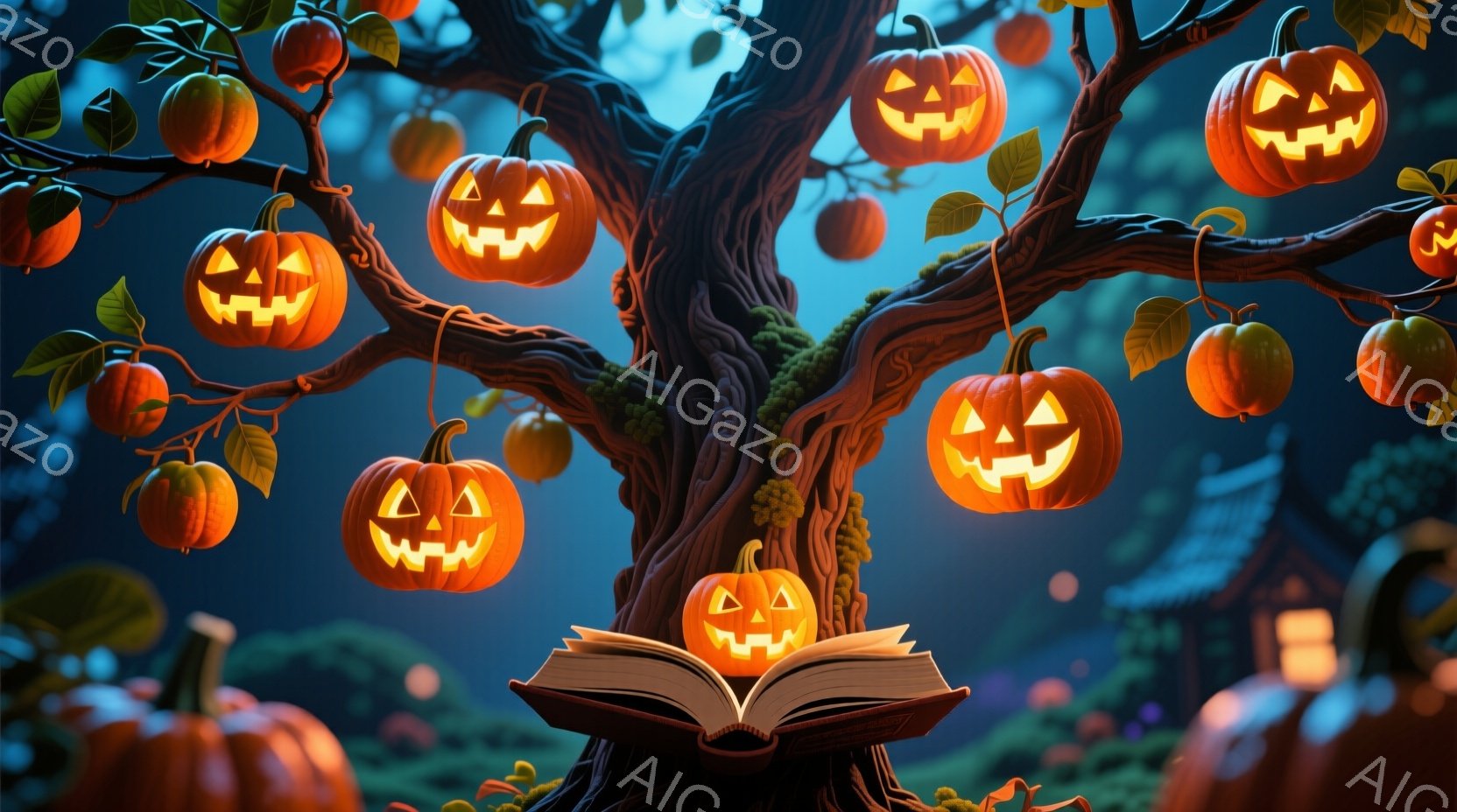 暗い森の中に、ハロウィーンの装飾が施された木が生い茂り、その枝にはジャック・オー・ランタンが吊るされています。木の根本には開かれた本が置かれており、本のページは柔らかい光を放っています。背景はぼやけた緑とオレンジ色で、奇妙で幻想的な雰囲気を醸し出しています。