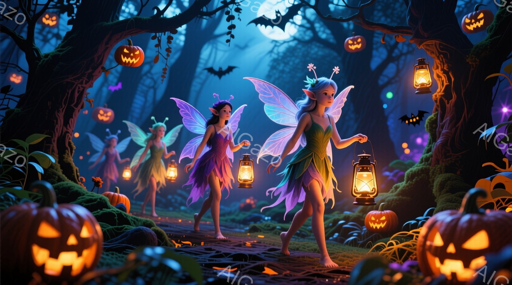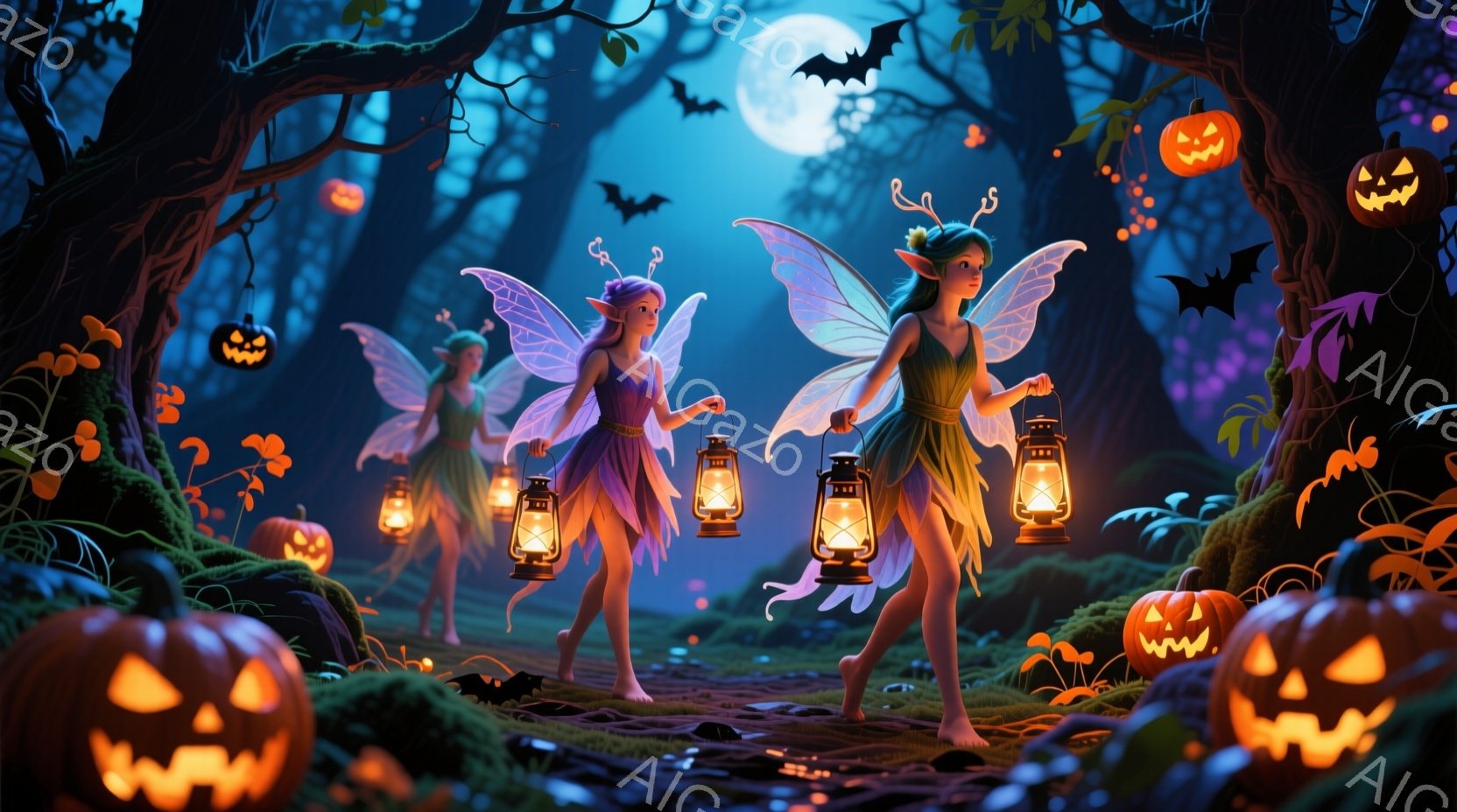 3人の妖精が、ランタンを手に、暗い森の中を歩いている。緑色の葉っぱでできたドレスを着ており、背中には透明な羽が生えている。背景には、さまざまな大きさのジャック・オー・ランタンが配置され、木の根や落ち葉が散らばる森の道が、ハロウィーンらしい不気味な雰囲気を醸し出している。