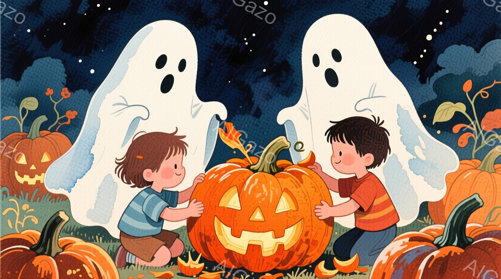 夜のパンプキンパッチで、少年と少女がジャック・オー・ランタンを彫っています。少年は茶色の髪で青いシャツと短いズボンを着用し、少女は黒髪をポニーテールにし、オレンジ色のトップスとスカートを着ています。背景には、さまざまな形や大きさのたくさんのジャック・オー・ランタンが散らばり、2つの幽霊が楽しそうに2人を囲んでいます。