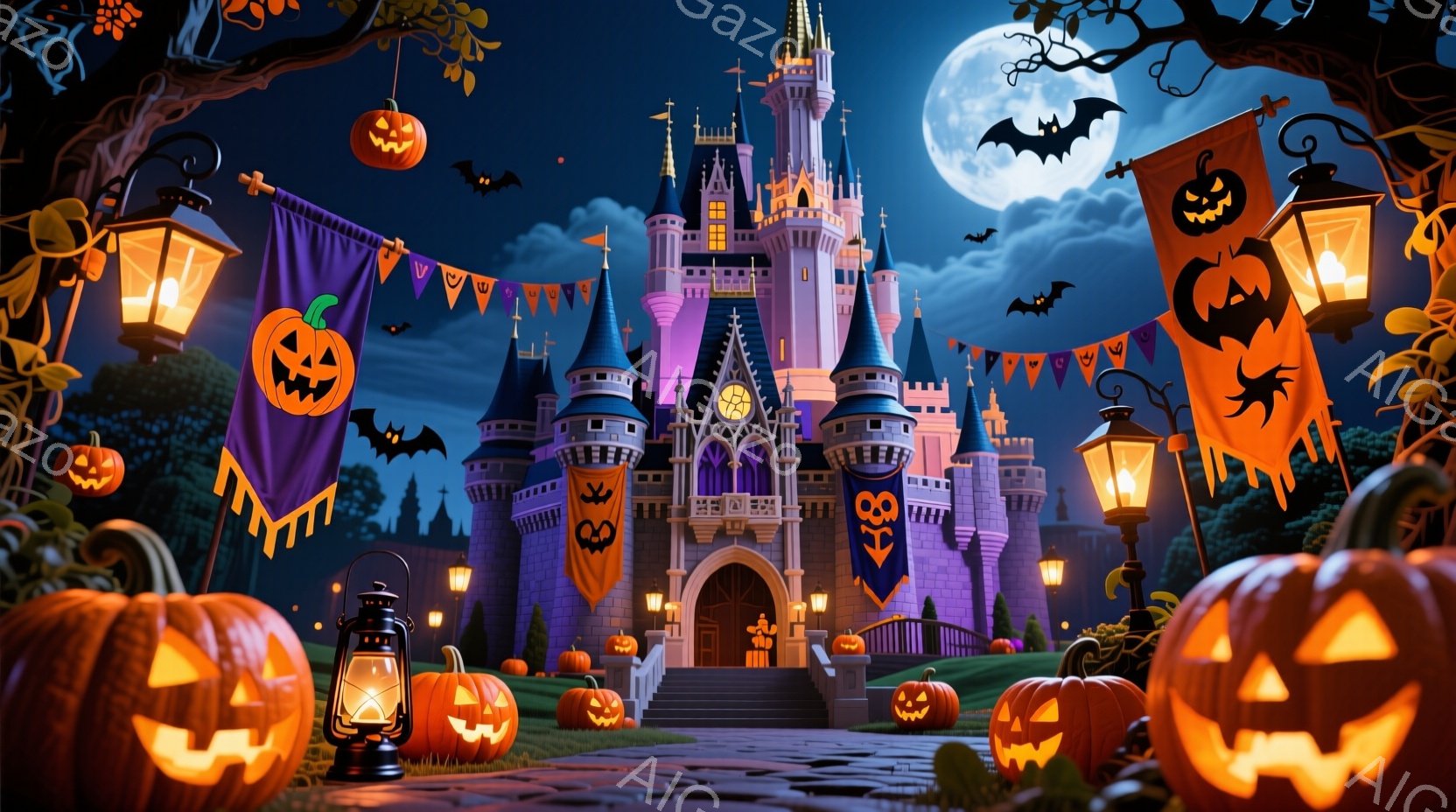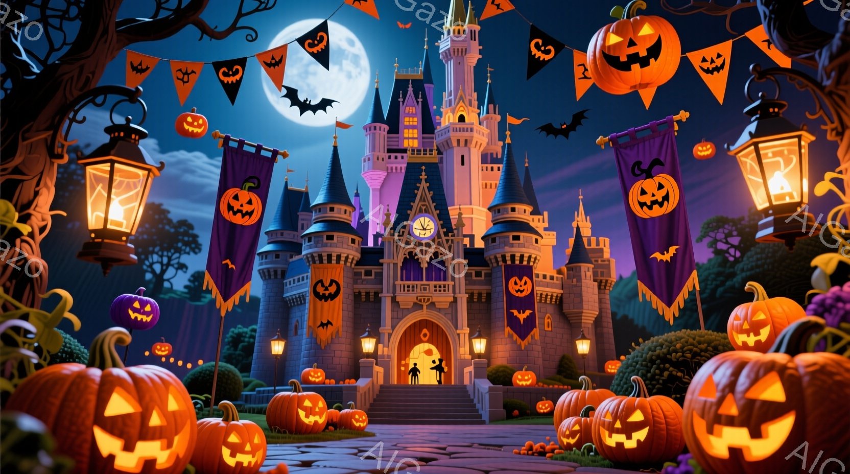 ハロウィーンの夜を舞台に、不気味で壮大な城がそびえ立っています。城はオレンジ色のランタンや、カボチャの顔が描かれた旗で飾られ、庭には様々な大きさのカボチャが置かれています。満月が輝き、背景にはコウモリが舞い、全体的に不気味でありながらも楽しいお祭り気分を醸し出しています。