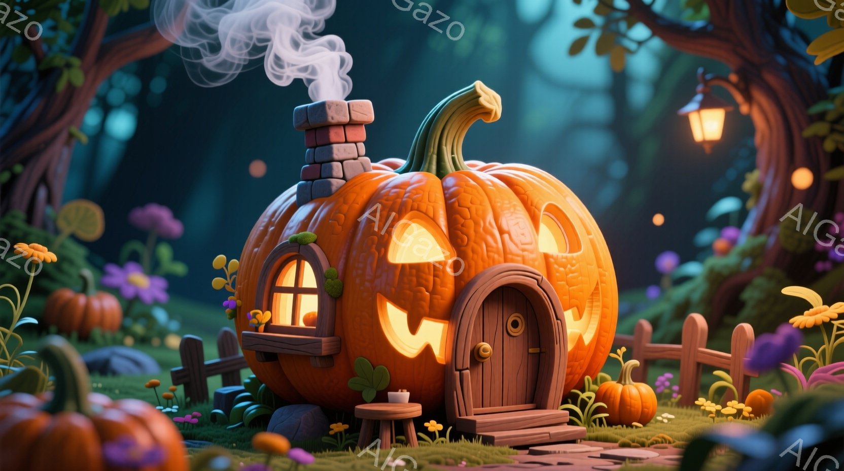 かぼちゃを模した可愛らしい家が、緑豊かな森の中にひっそりと佇んでいます。家はくり抜かれた笑顔と窓を持ち、煙突からは湯気が立ち上り、温かみのある雰囲気を醸し出しています。背景には色とりどりのきのこや、小さなかぼちゃが点在し、幻想的で趣のある秋の風景が広がっています。