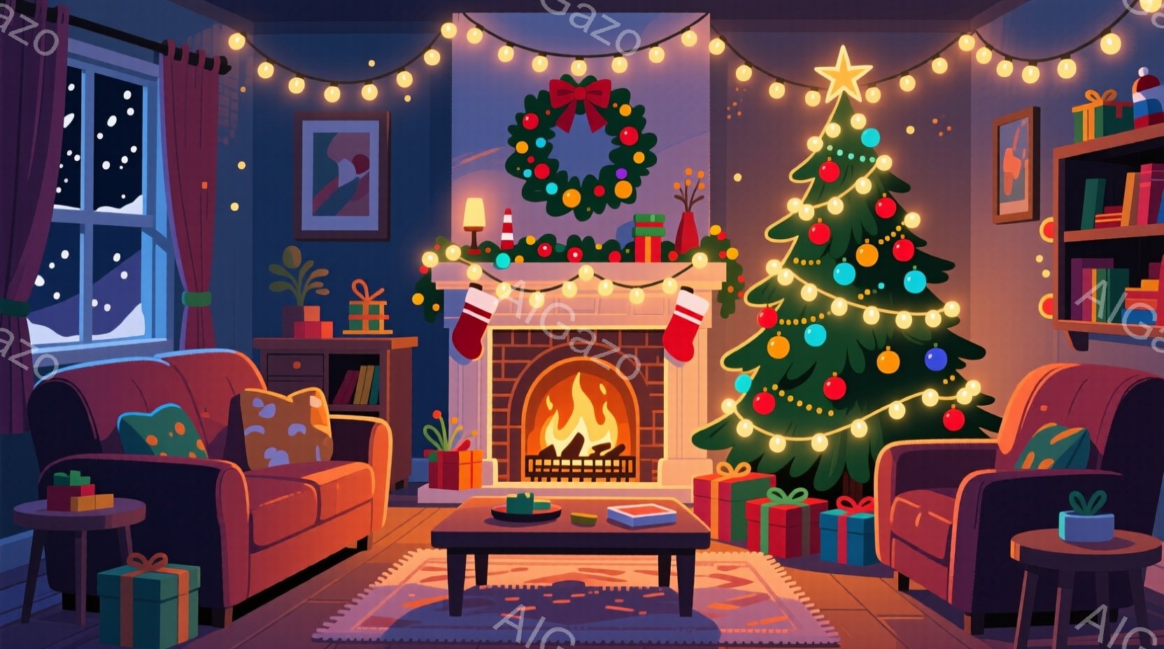 暖炉のある居間には、クリスマスツリーが飾られ、温かい光が灯っています。プレゼントがツリーの周りや暖炉の下に置かれており、クリスマスの雰囲気が満ちています。壁には絵画が飾られ、快適で穏やかな空間を作り出しています。