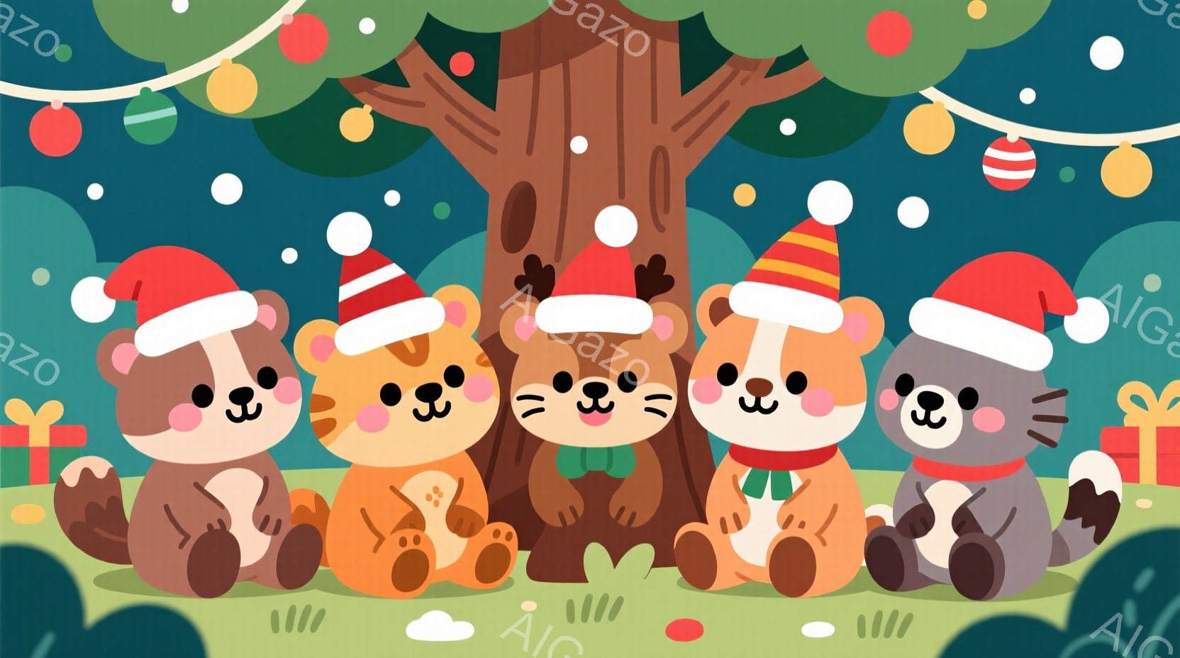 かわいい動物たちがクリスマスの帽子をかぶり、大きな木の根元に座って楽しんでいます。雪が降る白い背景に、緑の植物や赤い実がアクセントとなり、暖かいクリスマスの雰囲気を演出しています。動物たちは皆笑顔で、幸せなひとときを過ごしている様子が伝わってきます。
