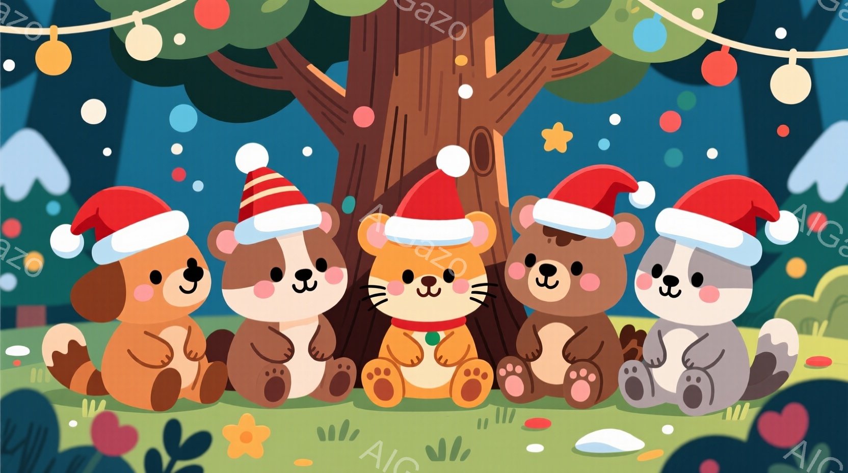 クリスマスの帽子をかぶった5匹の動物たちが、クリスマスツリーの根元に座ってプレゼントに囲まれています。それぞれの動物は異なる毛色と表情をしており、緑色のマフラーを巻いたクマや、笑顔のキツネなどが描かれています。背景には雪が降り積もり、穏やかで温かいクリスマスの雰囲気が漂っています。