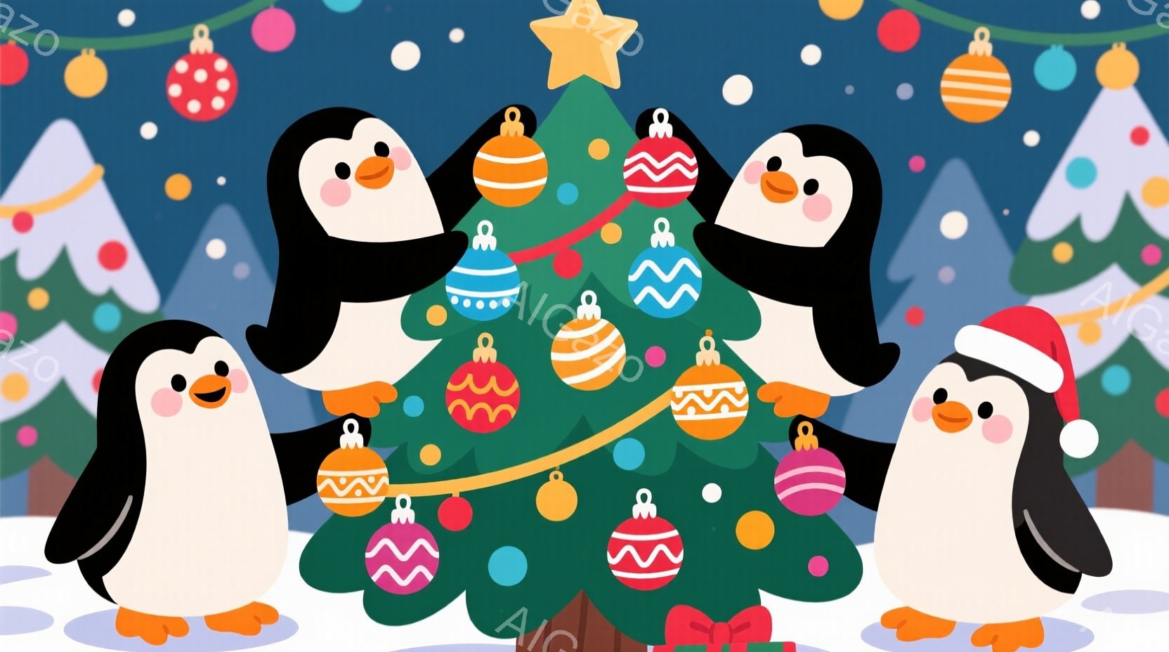 雪景色の中に、サンタ帽をかぶったペンギン3羽がクリスマスツリーの周りに集まっています。ツリーはオーナメントで飾られ、下にはカラフルなプレゼントが置かれています。全体的に明るく、暖かく、お祝いムードに満ちた雰囲気です。