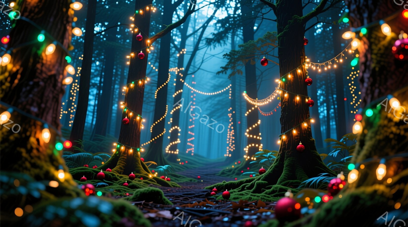 鬱蒼とした森の中に、クリスマスの飾り付けが施された幻想的な光景が広がっている。木々にはカラフルな電飾が巻き付けられ、地面にはプレゼントやキャンドルが散りばめられ、温かい光が辺りを照らしている。霧がかかった背景と、緑豊かな自然が、まるで絵本のようなクリスマスの世界観を醸し出している。