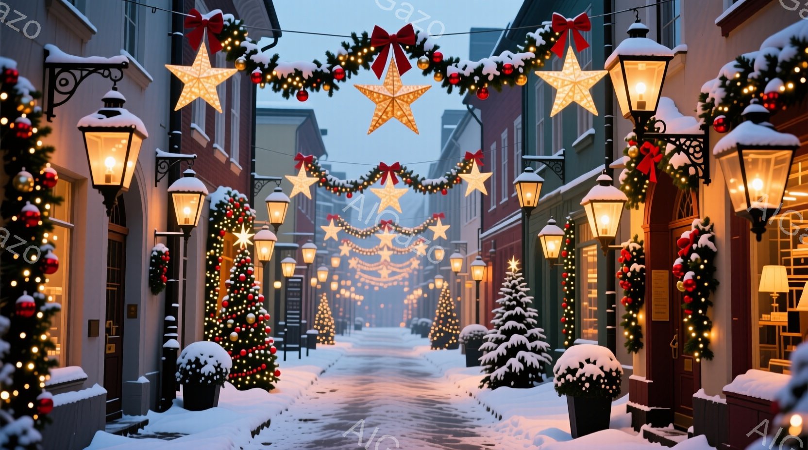 雪が降る石畳の通りが、クリスマス装飾で華やかに彩られています。街灯や建物に巻き付けられた電飾や、空中に飾られた星形のオーナメントが、温かく幻想的な雰囲気を醸し出しています。遠くに見える人物はコートを着ており、冬の寒さをしのぎながら歩いている様子です。