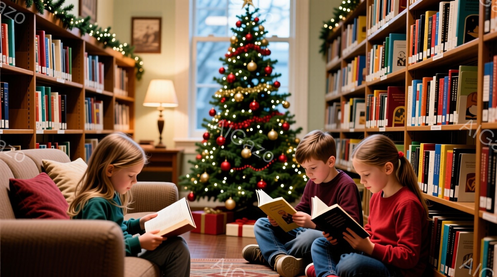 暖炉のある居間に、3人の子供たちがソファに座って本を読んでいます。緑、赤、ピンクのセーターを着た子供たちは、真剣な表情で本に集中しており、髪型はそれぞれ短髪と三つ編みです。背景にはクリスマスツリーやプレゼント、本棚が並び、暖かく穏やかなクリスマスの雰囲気が漂っています。