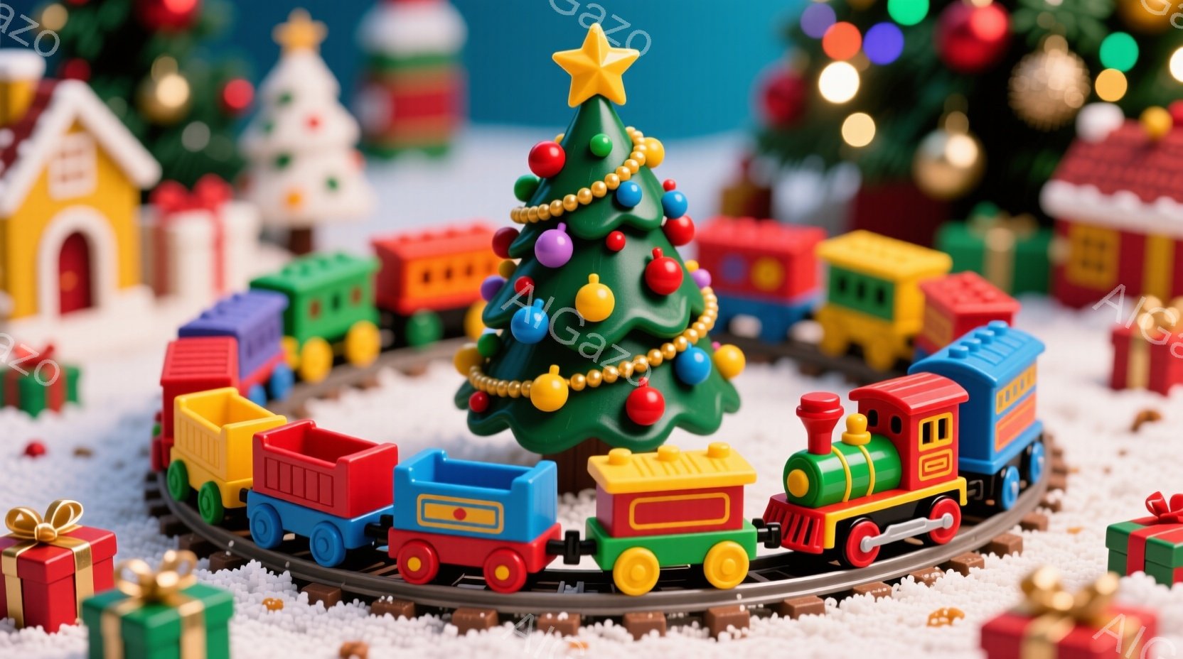 クリスマスツリーを中心に、カラフルなブリック製の列車が線路を周回している様子が描かれています。雪が積もった背景には、同様のブリック製の家々が配置され、プレゼントの箱が点在しています。全体的に暖かく、お祝いムードにあふれたクリスマスの情景が表現されています。