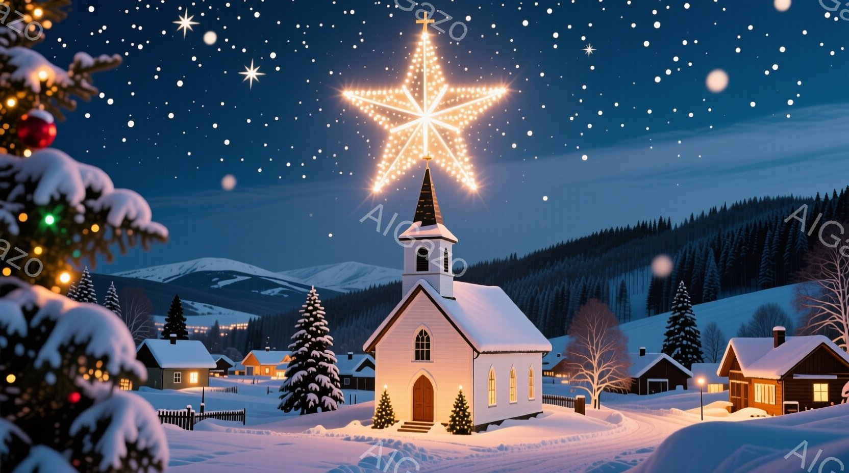 雪に覆われた静かな村の中に、美しい教会がそびえ立っています。教会の尖塔には大きな星型の光が輝き、周囲の家々や木々も温かい光で照らされ、クリスマスの雰囲気を醸し出しています。雪景色と星空が相まって、幻想的で平和な夜の光景が広がっています。
