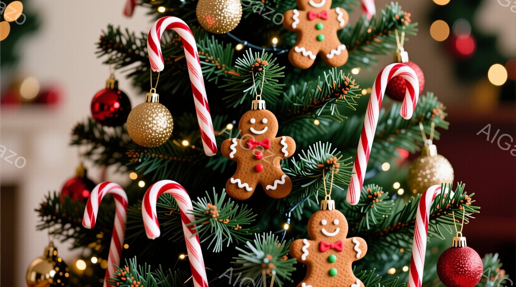 クリスマスツリーが赤と金のオーナメント、キャンディケーン、そしてジンジャーブレッドクッキーで飾られています。ツリーの緑豊かな葉は、暖かく楽しい雰囲気を醸し出し、背景はぼやけた光の点々で華やかさを添えています。全体的に、この画像はクリスマスの喜びと祝祭的な気分を表現しています。
