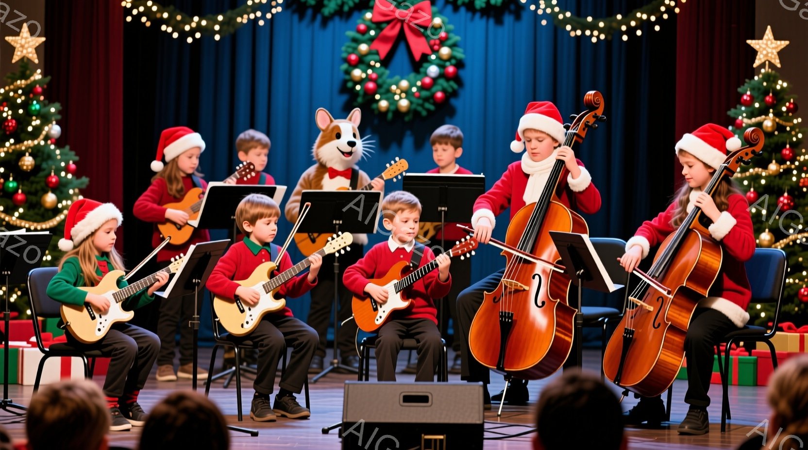 クリスマスの装飾が施された舞台上で演奏する子供たちの楽団が写っています。子供たちは赤いサンタの帽子をかぶり、緑や赤の冬の衣装を着ており、それぞれギター、ピアノ、チェロなどの楽器を演奏しています。背景にはクリスマスツリーと装飾が施されたリースがあり、全体的に温かく、お祝いの雰囲気が漂っています。