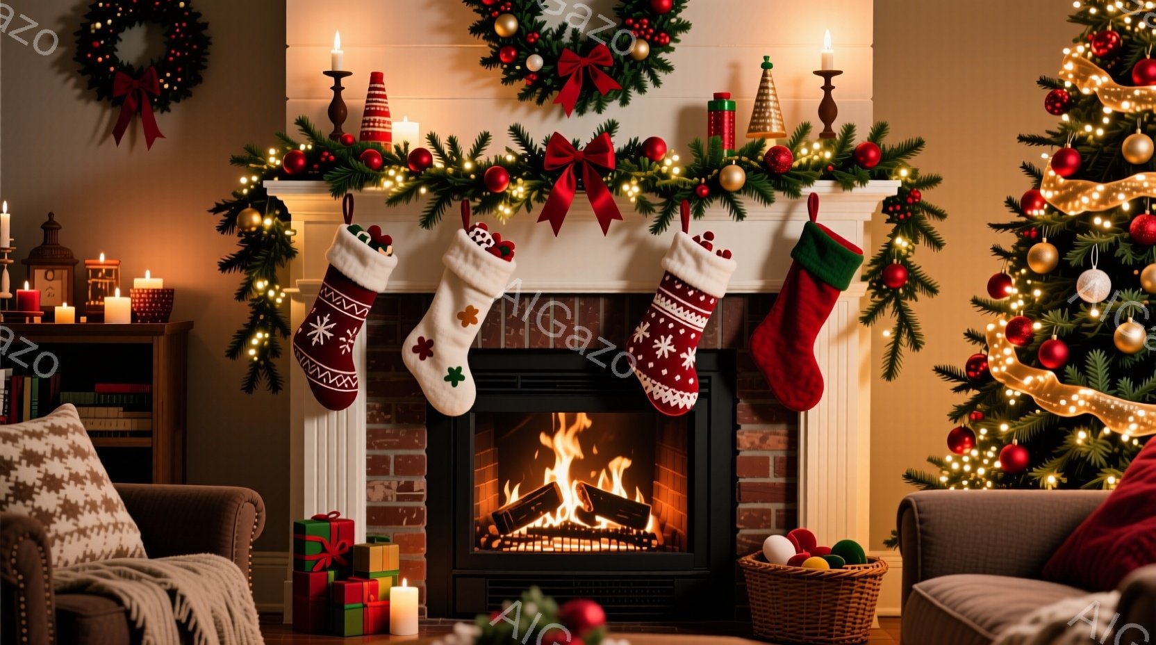 暖炉の前に飾られたクリスマスツリーと、暖炉の上に吊るされたクリスマスストッキングが印象的な光景です。暖炉の中では炎が燃え盛り、部屋全体を暖かく照らしています。背景には、クリスマスリースやプレゼント、キャンドルなどが配置され、温かく、お祝いの雰囲気が漂っています。