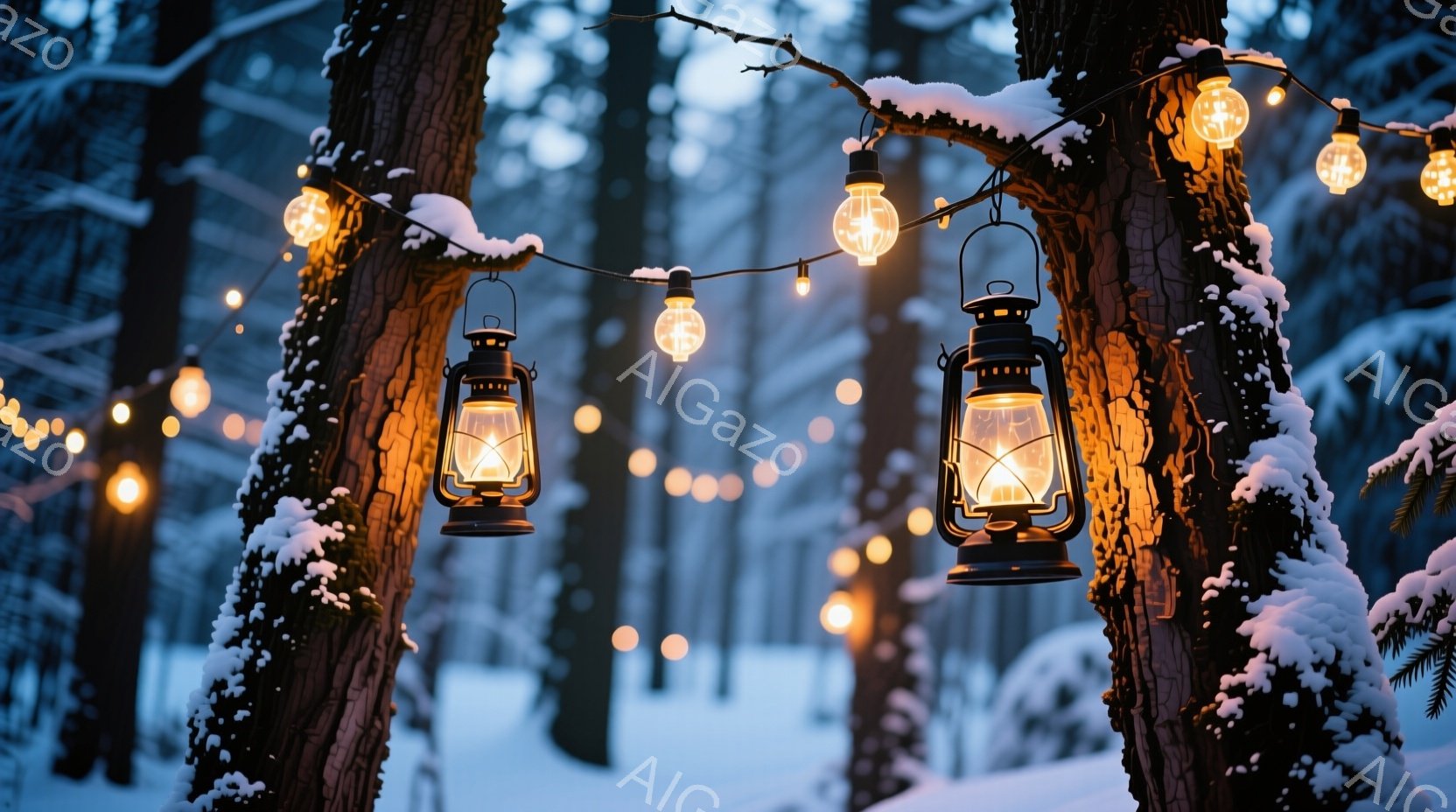 雪に覆われた森林の中で、木の間に提灯のような電球が飾られたロープが張られています。提灯はレトロなデザインで、温かい光を放ち、周囲の白銀の世界とのコントラストを際立たせています。冬の静寂と幻想的な雰囲気が漂う、美しい風景です。