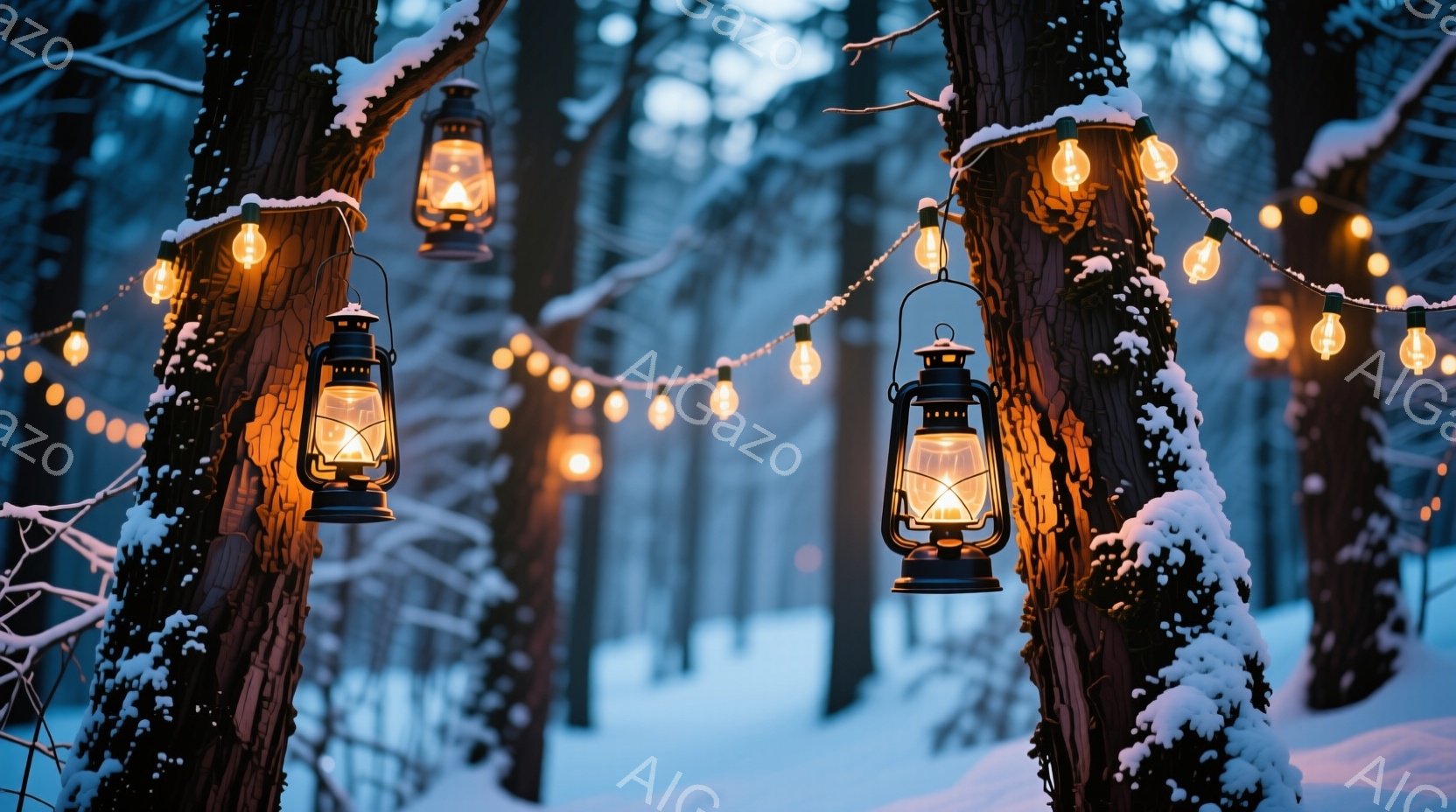 画像は雪に覆われた森林の中で、暖色の電球が繋がった飾り付けが木々に吊り下げられている様子を捉えています。雪が積もった木の幹と、ぼんやりとした背景の木々が幻想的な雰囲気を醸し出しており、冬の静寂と温かさが共存する様子が伝わってきます。電球の光は、暗い森の中で温かく柔らかい光を放ち、冬の夜の魅力を引き立てています。
