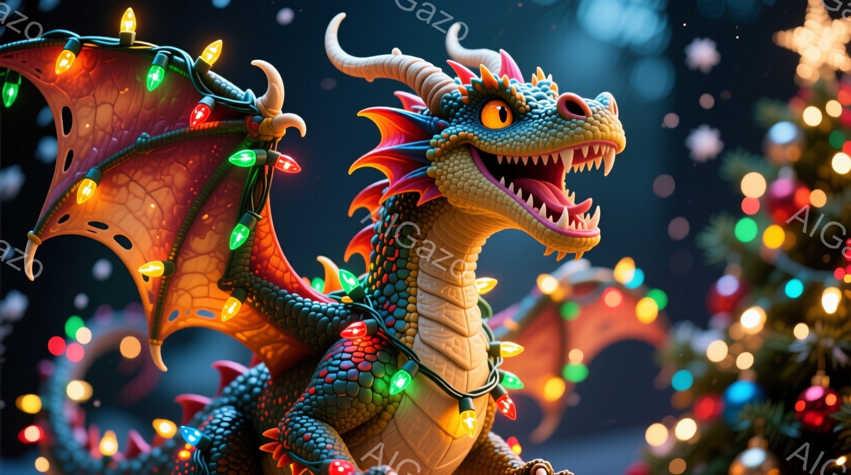 鮮やかな色彩の竜が、クリスマスの飾り付けである電球のイルミネーションを身にまとっています。その表情は興奮と楽しみに満ちており、大きく口を開けて鋭い歯を見せています。背景にはぼやけたクリスマスツリーと、降り注ぐ雪が確認でき、全体的に祝祭的で賑やかな雰囲気を醸し出しています。