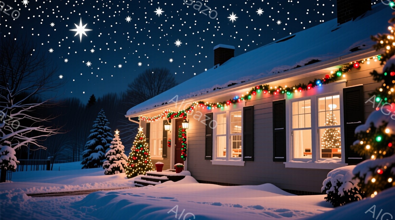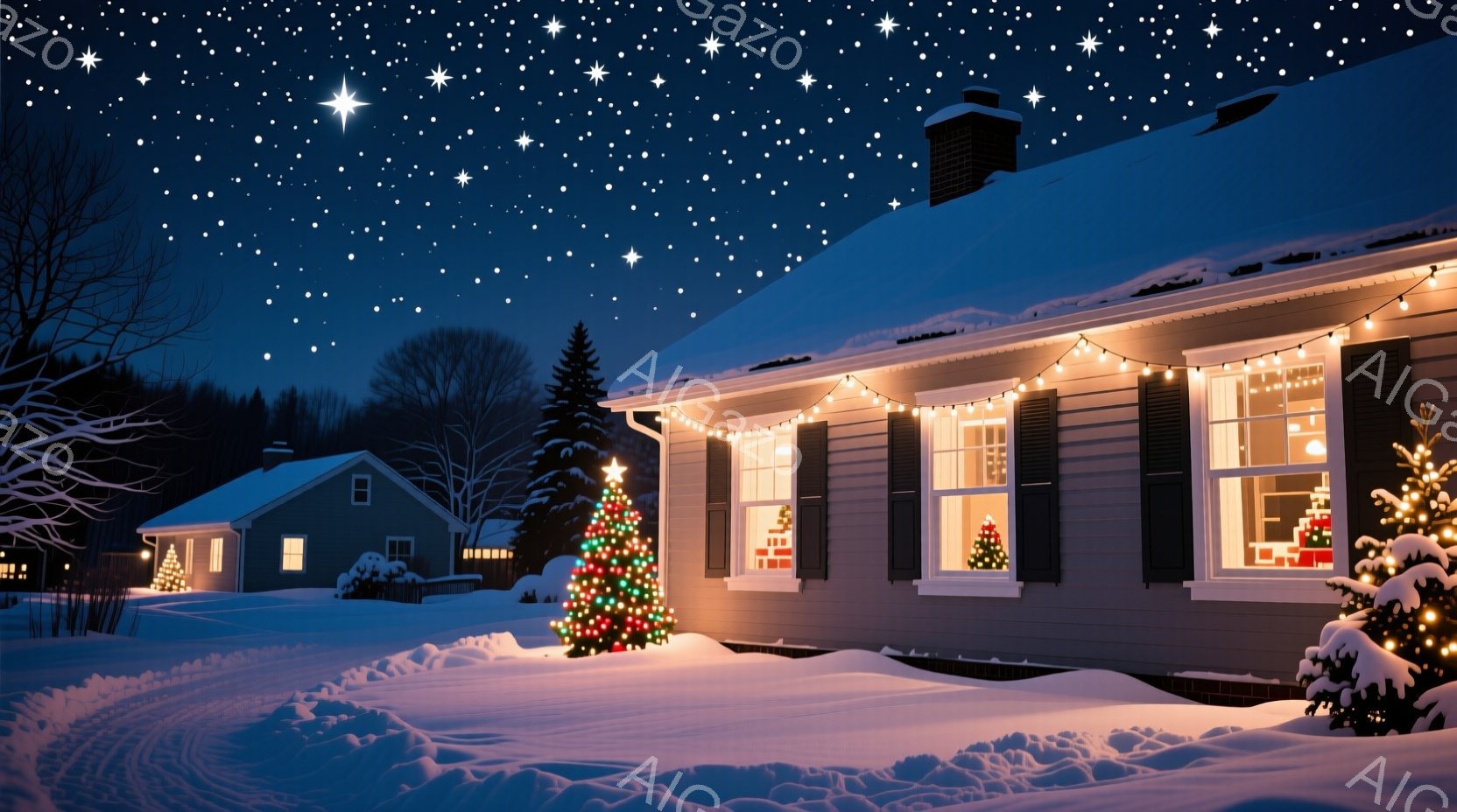 雪に覆われた住宅街の夜、一軒の家がクリスマス装飾で輝いている。家の周りには雪が積もり、庭には飾られたクリスマスツリーが置かれ、窓からは温かい光が漏れ出している。星が輝く夜空と、暖かな光が合わさり、穏やかで心温まるクリスマスの雰囲気が漂っている。