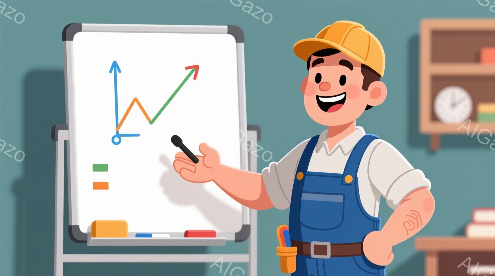 作業着を着た男性が、白いホワイトボードの前に立っています。彼はオーバーオールと白いシャツを着ており、頭には黄色いヘルメットを被っています。彼は片手に棒を持ち、ホワイトボードに描かれたグラフを指しており、笑顔で自信に満ちた表情をしています。