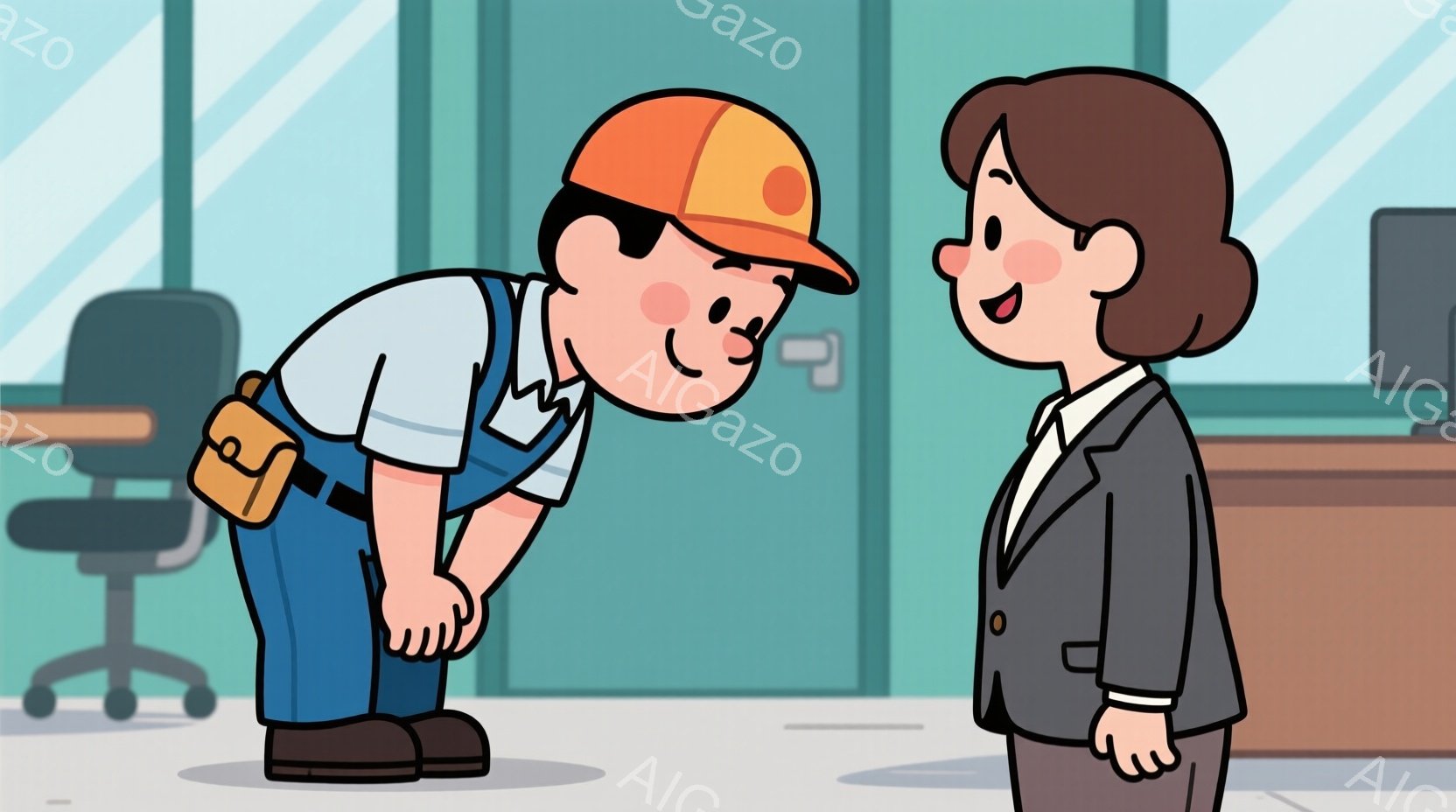 作業着を着た男性が女性に向かってお辞儀をしています。男性は紺色のつなぎ服にオレンジ色のツールベルトを巻いており、キャップを被っています。女性は黒いスーツに赤いシャツを着ており、笑顔で男性を見下ろしています。