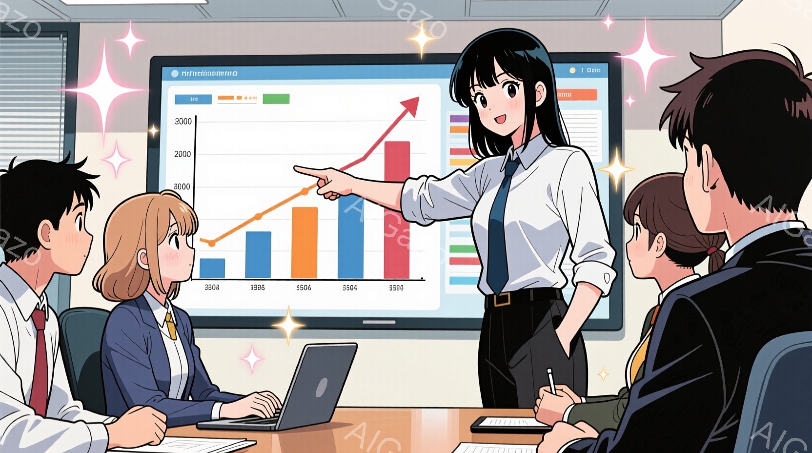 会議室で、一人の男性がプレゼンテーションをしている様子が描かれています。彼はスーツを着ており、指を伸ばしてグラフを指しています。参加者たちはパソコンに向かい、熱心に話を聞いている様子で、女性は長い髪を下ろしており、集中した表情をしています。