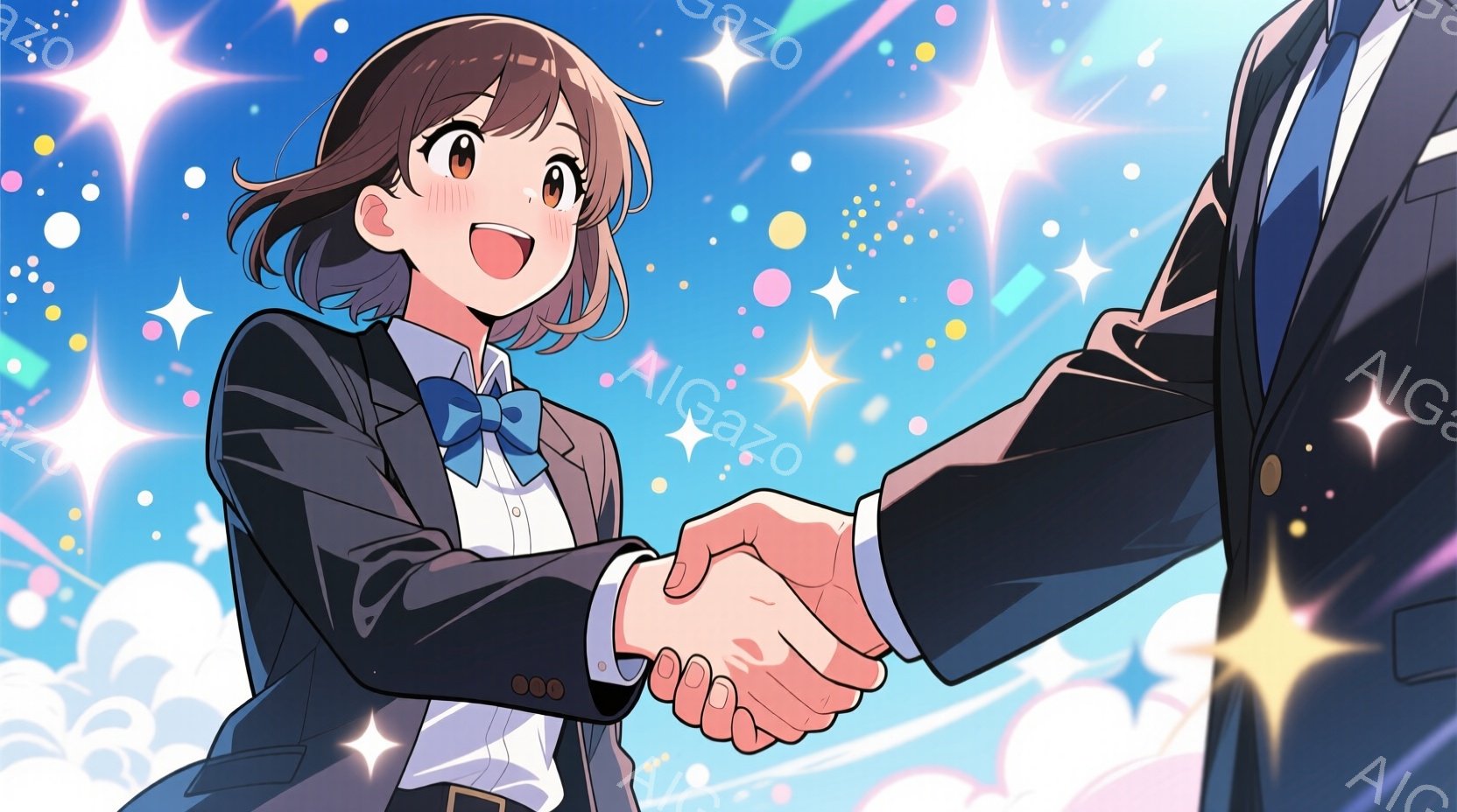 握手を交わす男女が描かれています。女性は茶色のボブヘアで、白いシャツに赤いリボン、黒いジャケット姿で、笑顔を見せています。男性は黒髪で、白いシャツにネクタイ、黒いジャケット姿で、IDカードを首から下げ、こちらも笑顔で握手しています。背景はピンクと水色のグラデーションで、星のような光が散りばめられており、華やかで明るい雰囲気が漂っています。