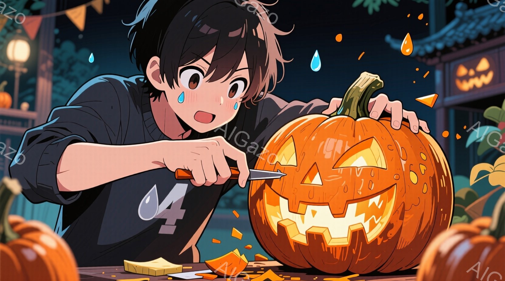 若い男性が、ハロウィーンの飾りであるカボチャを彫刻している様子が描かれています。黒い長袖シャツを着ており、少し乱れた黒髪と驚いた表情をしています。背景には、彫刻済みのカボチャや、少し暗い室内が描かれ、ハロウィーンの夜の賑やかさと、少しの緊張感が感じられます。