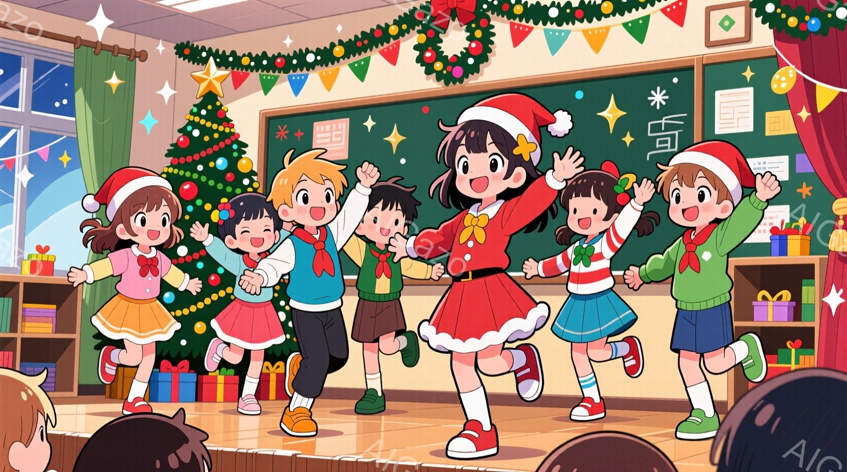 複数の子供たちがクリスマスをテーマにしたステージで踊っています。赤いサンタ帽をかぶった女の子は、白いフリルのついた赤いワンピースを着て、楽しそうに手を振っています。背景にはクリスマスツリーやプレゼント、そしてクラスルームの様子が見え、全体的に明るく活気のあるお祝いの雰囲気です。
