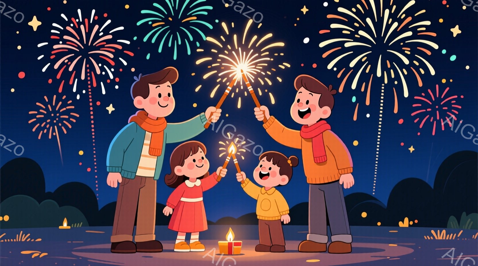 家族四人が夜に花火を楽しんでいるイラストです。両親はそれぞれ赤いジャケットを着ており、子どもたちはピンクとオレンジの服を着ています。背景には、ぼやけた建物と木々、そして夜空に咲き乱れる花火が描かれ、暖かく幸せな雰囲気を醸し出しています。