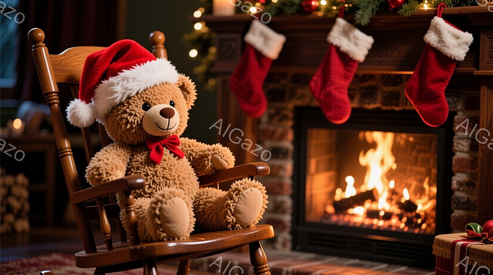 暖炉の前には、赤いサンタ帽をかぶったテディベアがロッキングチェアに座っています。背景には、クリスマスツリーの光と、壁に飾られたクリスマスストッキングがあり、温かく居心地の良い雰囲気を醸し出しています。暖炉の火はパチパチと音を立て、暖かな光を部屋全体に広げています。