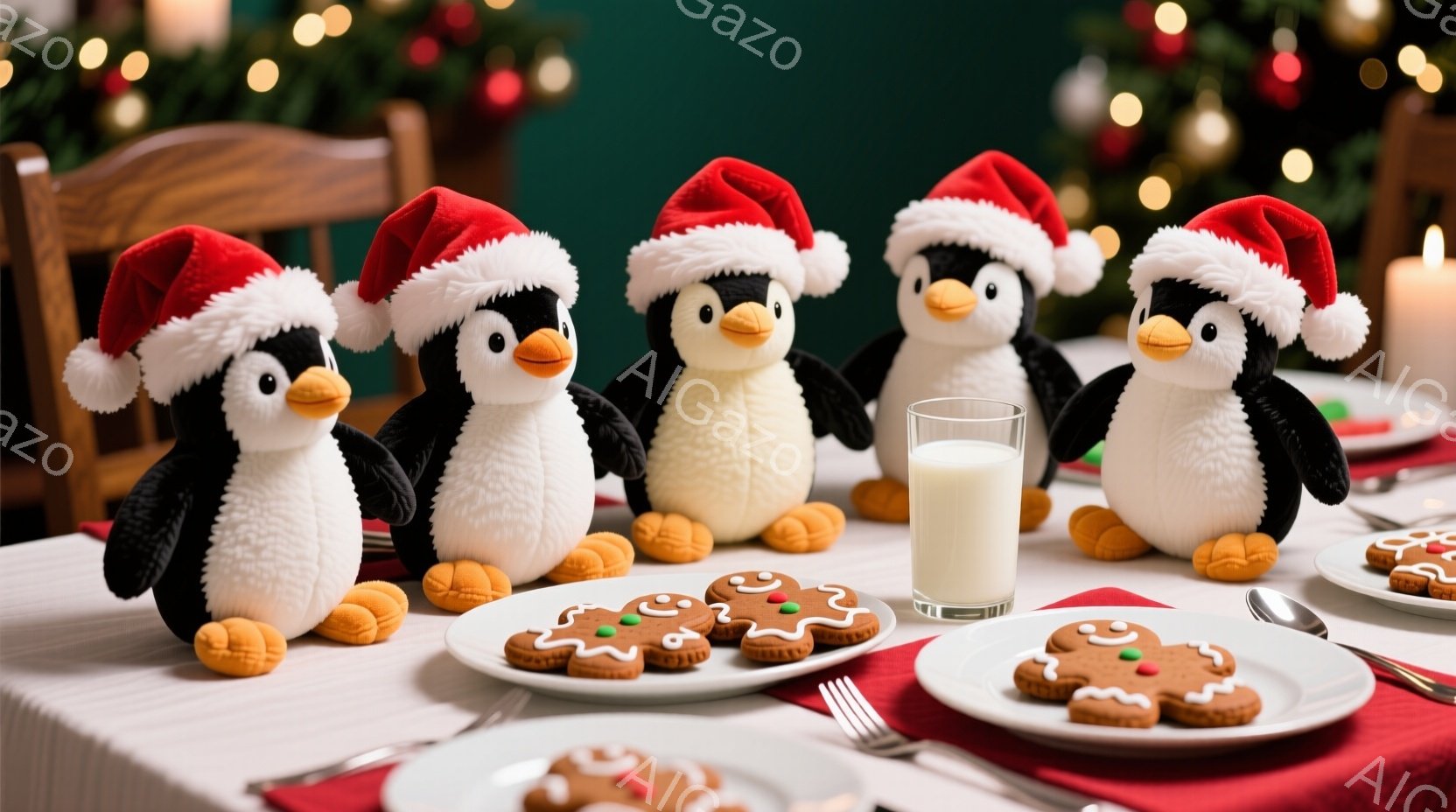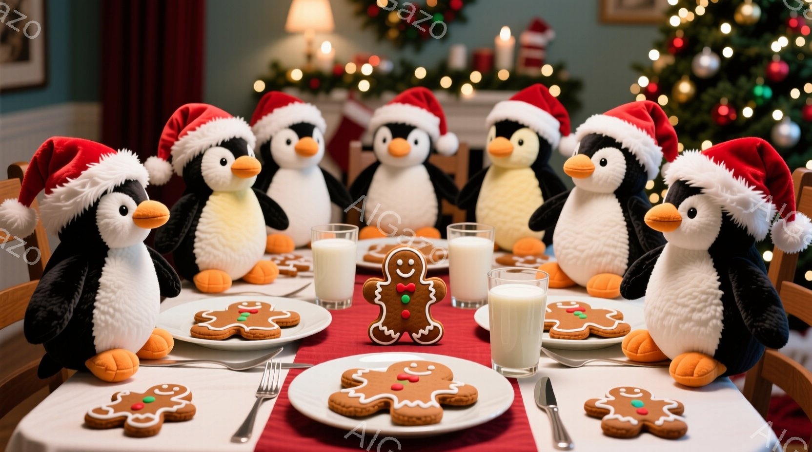 クリスマスをテーマにした画像で、サンタ帽をかぶった可愛らしいペンギンたちがテーブルを囲んでいます。テーブルの上には、ジンジャーブレッドクッキーやミルクグラスが置かれ、クリスマスの飾り付けが背景に見えます。全体的に温かく、お祝いムードに満ちた雰囲気です。