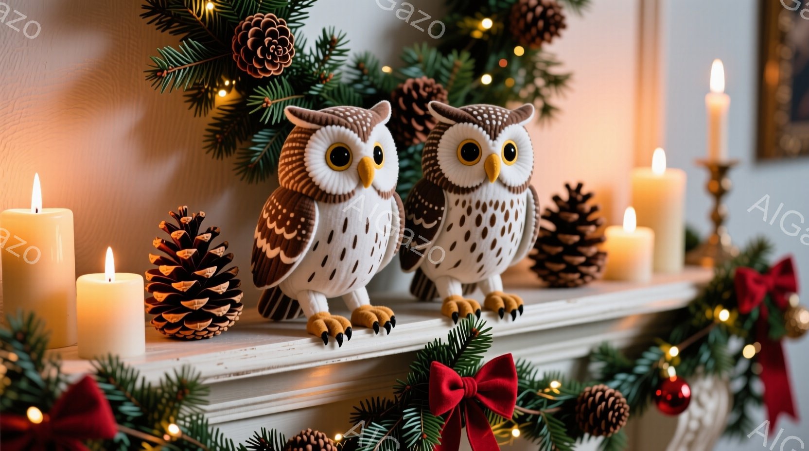 白い暖炉の上に、可愛らしいフクロウの置物が置かれています。周りには松ぼっくりと赤いリボンで飾られたクリスマスツリーの枝が広がり、温かい光を放つキャンドルが並べられています。全体的に、暖かく、穏やかで、クリスマスの雰囲気が漂う、心地よい空間を表現しています。