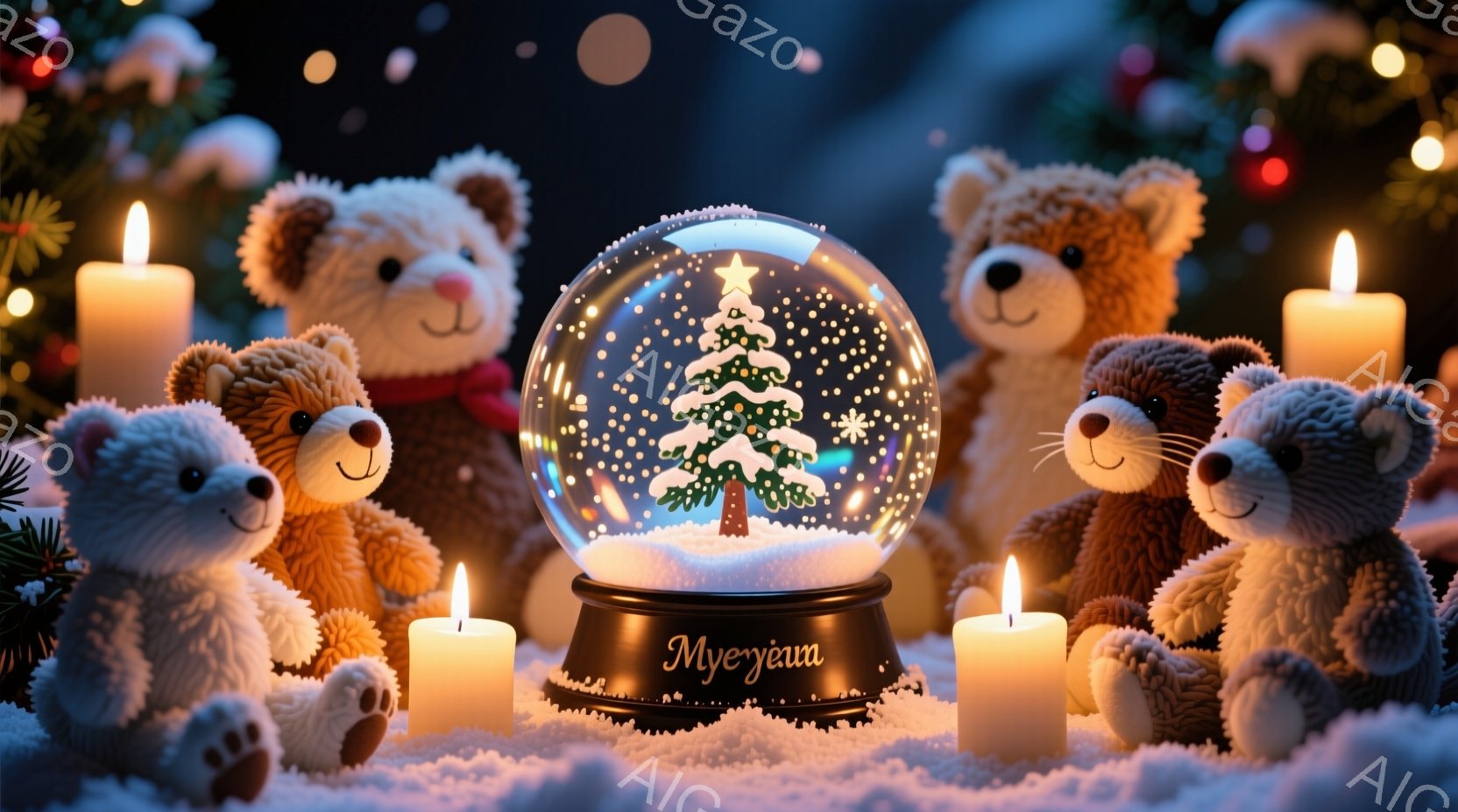 暖炉の前にセットされたクリスマスの食卓に、大きなテディベアが座っています。ベアは赤いリボンと緑色のアクセサリーを身に着け、片手にキャンディケーンを持っています。テーブルの上には、ジンジャーブレッドクッキーが散りばめられ、暖炉の光とキラキラ光るクリスマスツリーが、温かくお祝いの雰囲気を演出しています。