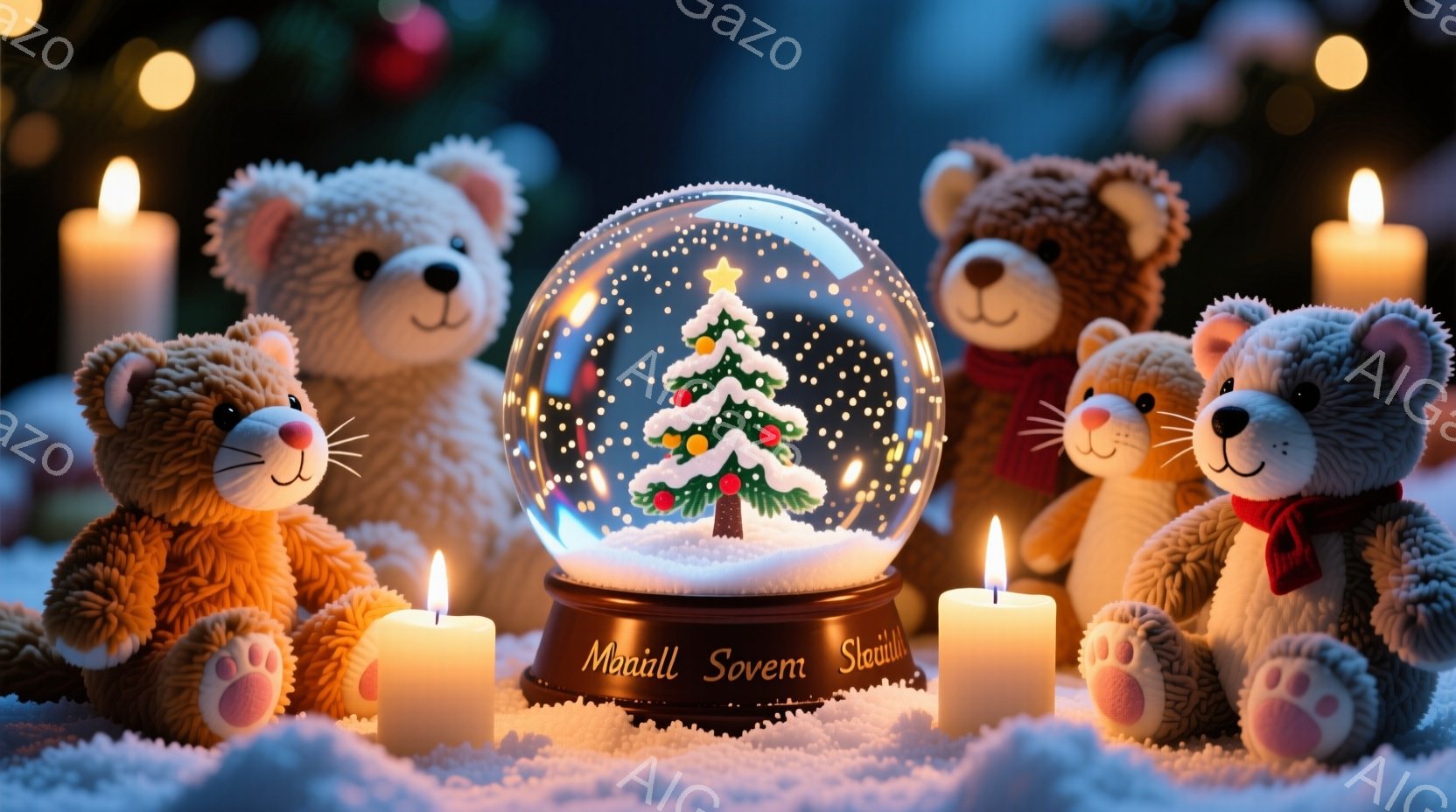 暖炉のそばの雪景色の中に、可愛らしいテディベアたちが集まっています。彼らはそれぞれ異なるポーズで座り、一部は赤いリボンを首に巻いており、中央には雪が舞うクリスマスのツリーが入ったスノーグローブが置かれています。背景にはぼんやりとした光が灯り、全体的に温かく、お祝いの雰囲気を醸し出しています。