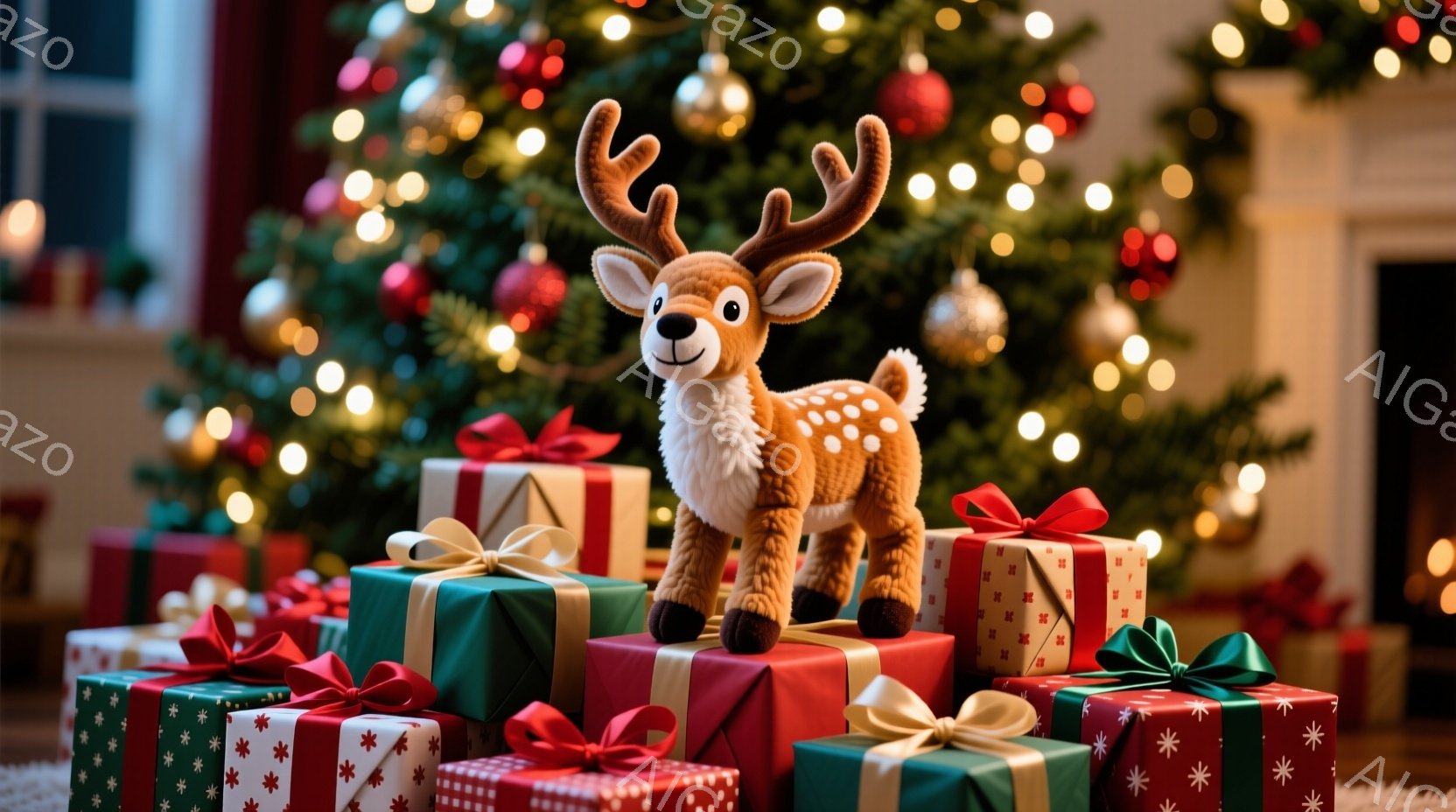 ぬいぐるみのような茶色のシカが、赤と緑のラッピングされたプレゼントの山の上に立っています。背景には、ぼやけたクリスマスツリーと、キラキラと光る暖かい色のライトが見え、お祝いの雰囲気を醸し出しています。全体的に、温かく、穏やかで、幸せなクリスマスの雰囲気が感じられます。