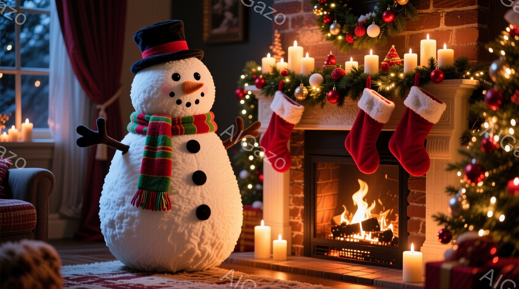暖炉の前には、大きな雪だるみが立っており、黒い帽子、緑と赤のストライプのスカーフ、そして黒いボタンでできています。暖炉は燃え盛っており、クリスマスのリースとストッキングが飾られ、周囲にはキャンドルが灯されています。このシーンは暖かく、お祝いの雰囲気で満たされています。