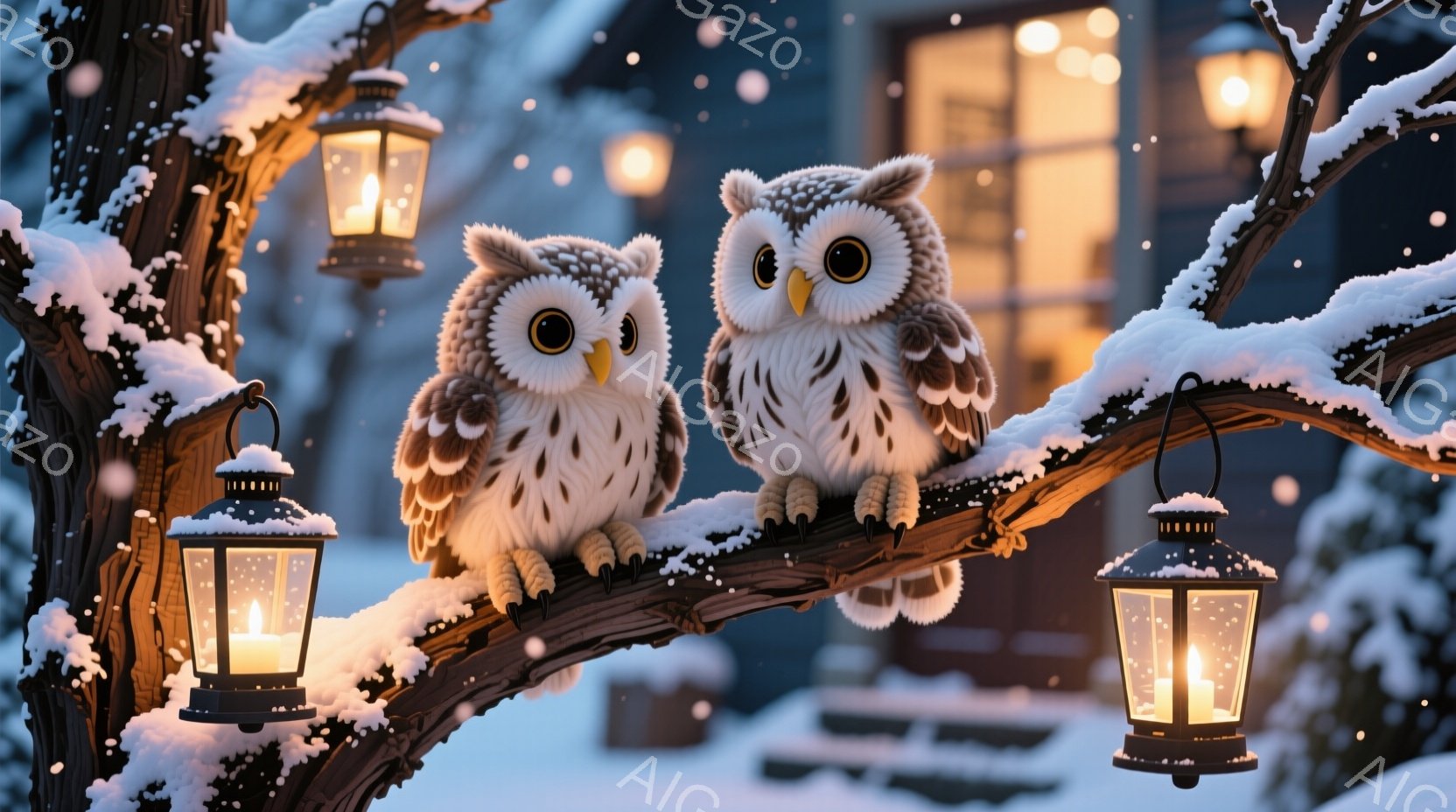 雪に覆われた木の枝に、丸い目をした可愛らしいフクロウが二羽並んで座っています。暖かく光るランタンが周囲を照らし、背景にはぼんやりと家が見え、冬の穏やかな夜の雰囲気を醸し出しています。雪が静かに降り積もり、温かく幻想的な光景を作り出しています。