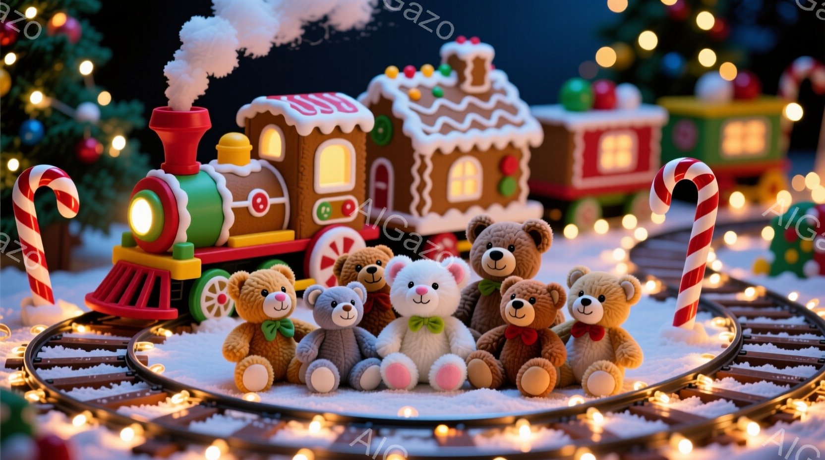 クリスマスを祝う温かいシーンが描かれています。大きな暖炉の前に、ロッキングホースに乗ったテディベアがサンタの帽子とケープを身につけ、楽しそうにしています。背景にはクリスマスツリーとプレゼント、そして暖炉からこぼれる炎が暖かさと幸福感を漂わせています。