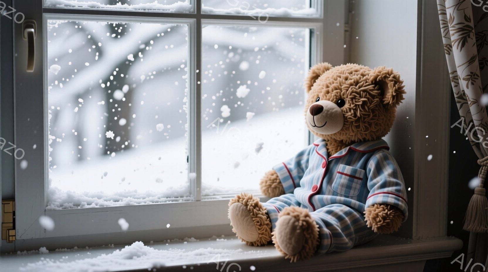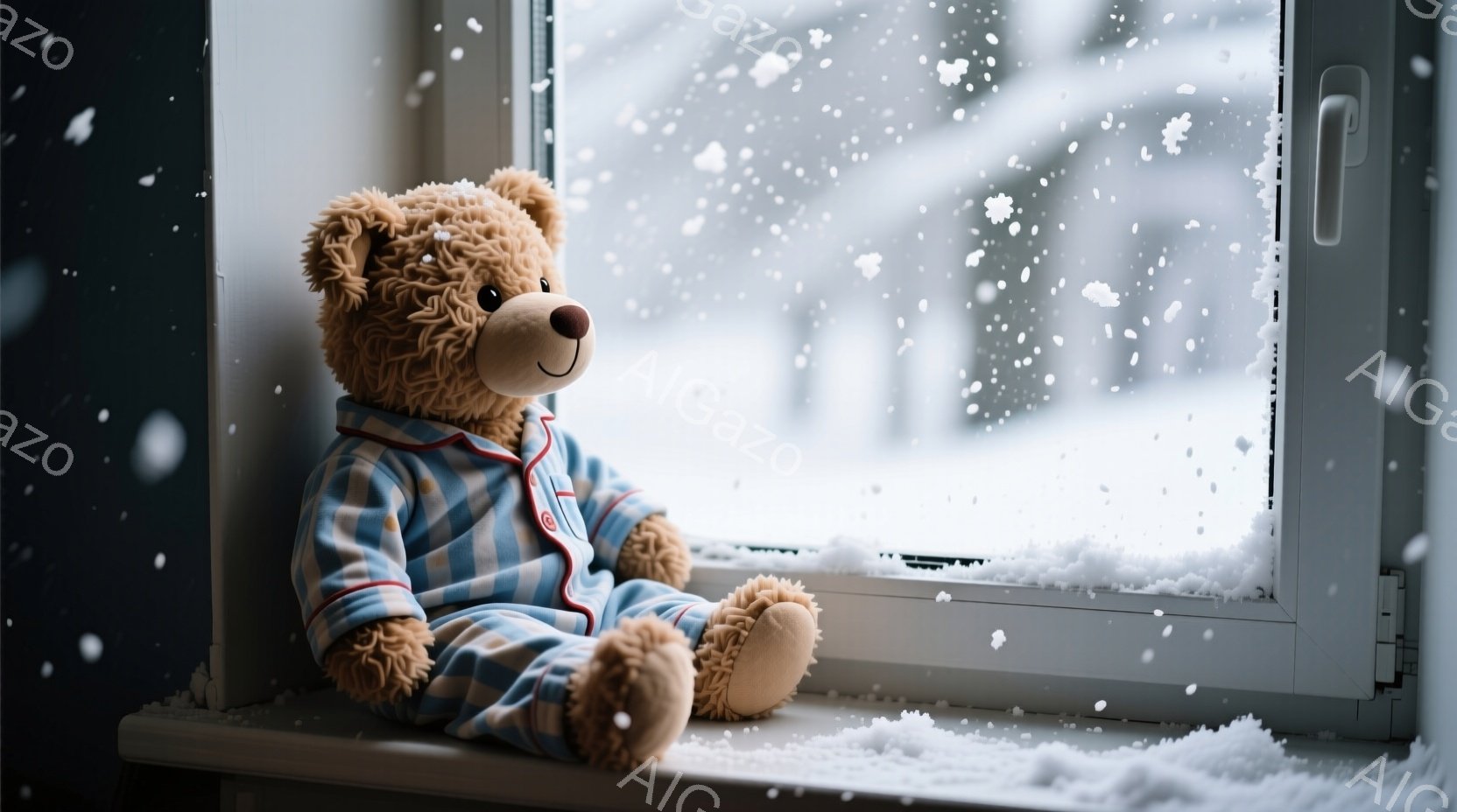 茶色のテディベアが、青いチェック柄のパジャマを着て、窓枠に座っています。外は雪が降り積もり、白い景色が広がっており、暖かさと静けさの雰囲気が漂います。ベアは少し寂しげな表情で外を眺めているように見えます。